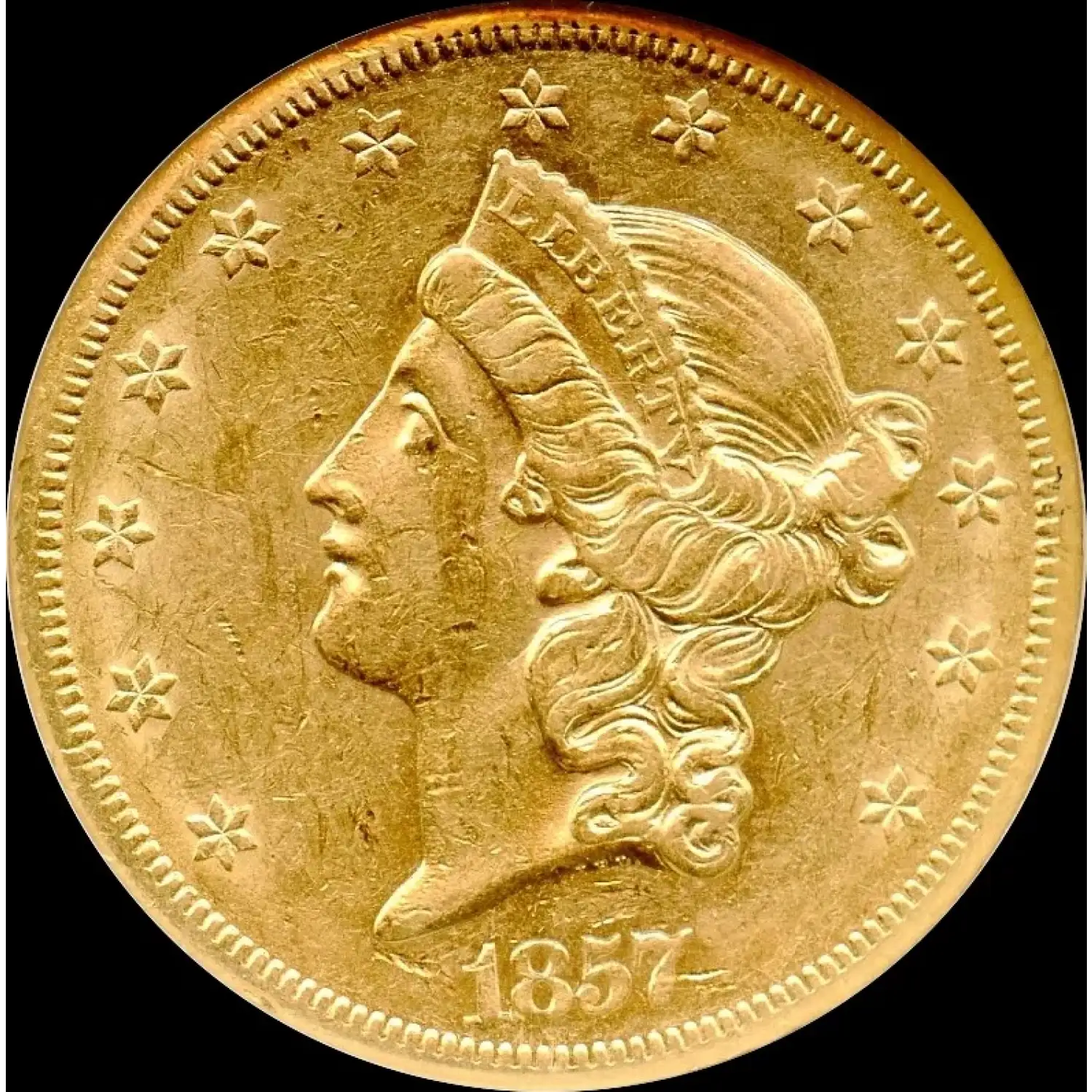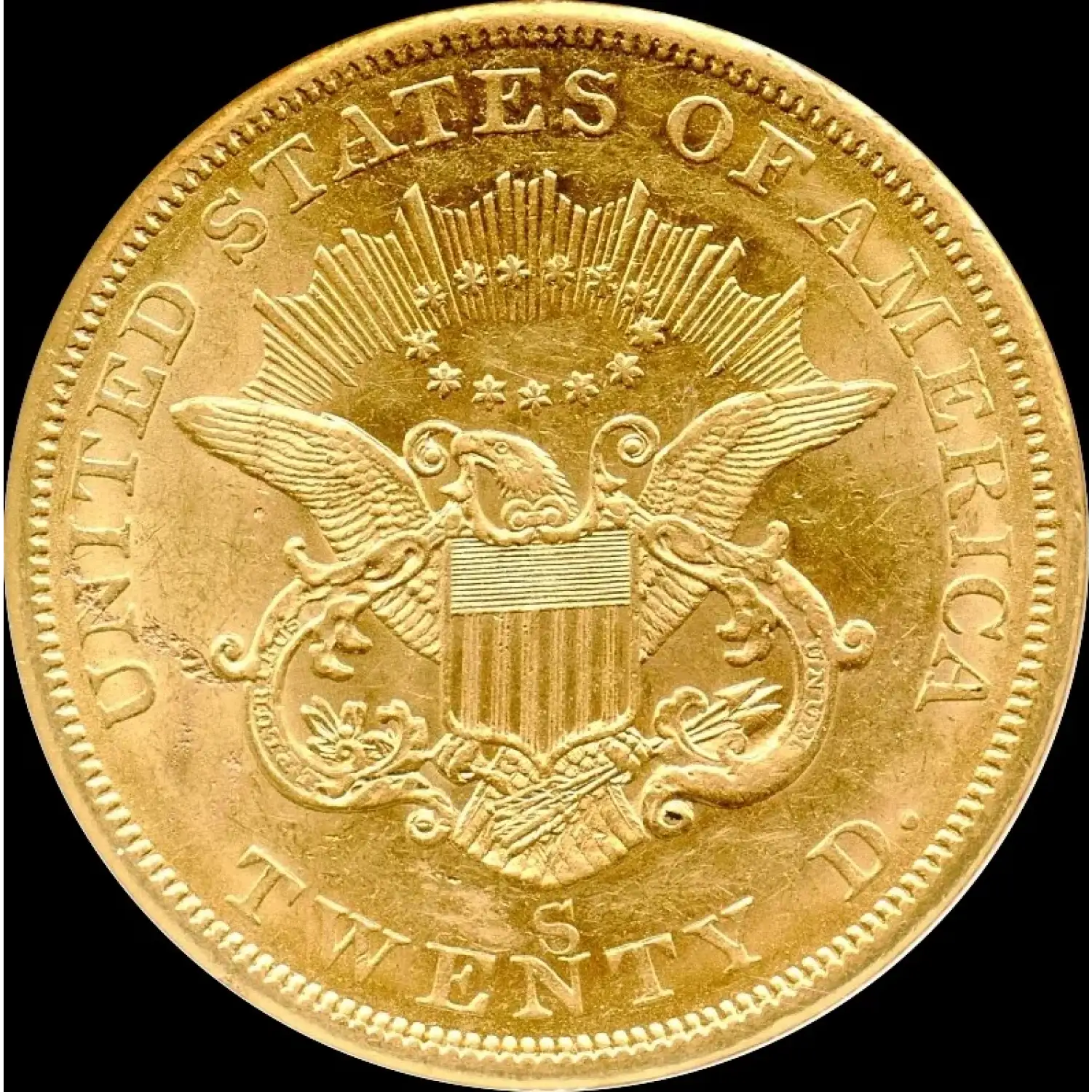 The 1857-S $20 Liberty Head Double Eagle stands out among San Francisco Mint issues due to its distinctive inverted “S” mintmark. Struck during the California Gold Rush, this variety occurred when the mintmark punch was accidentally oriented upside down before being applied to the die. Only a small portion of the 1857-S twenties exhibit this error, making it a recognized and collected variety among numismatists.