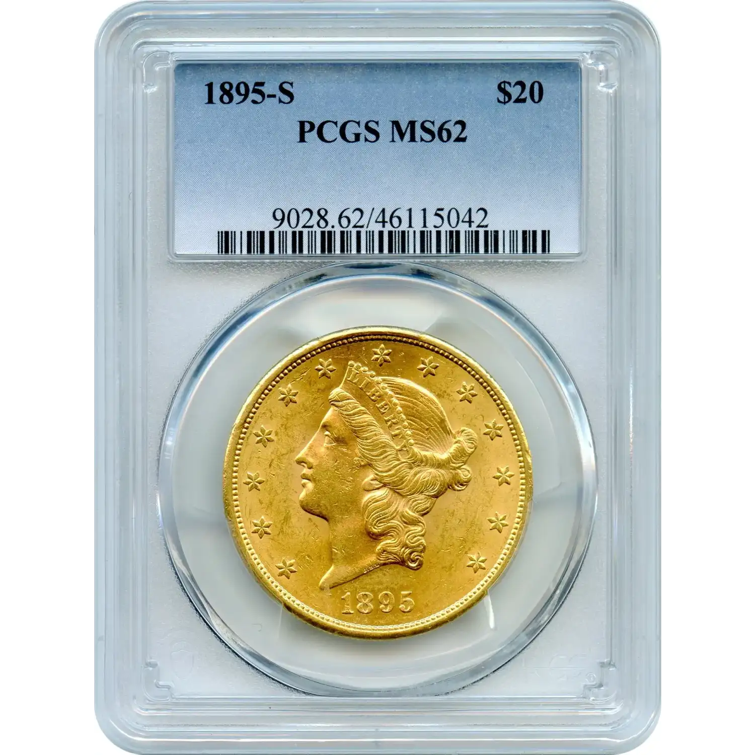 The 1895-S $20 Liberty Head Double Eagle represents the mature phase of America’s largest circulating gold denomination. PCGS has graded 4,098 as MS62 with 2,182 finer.