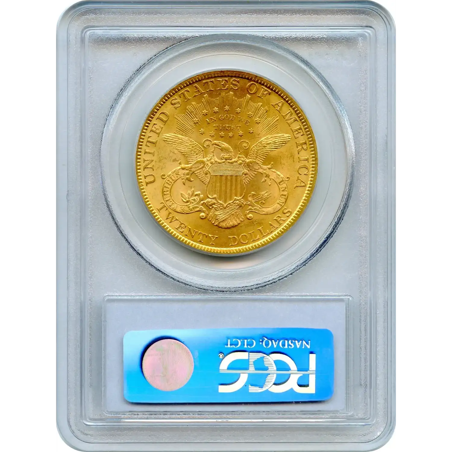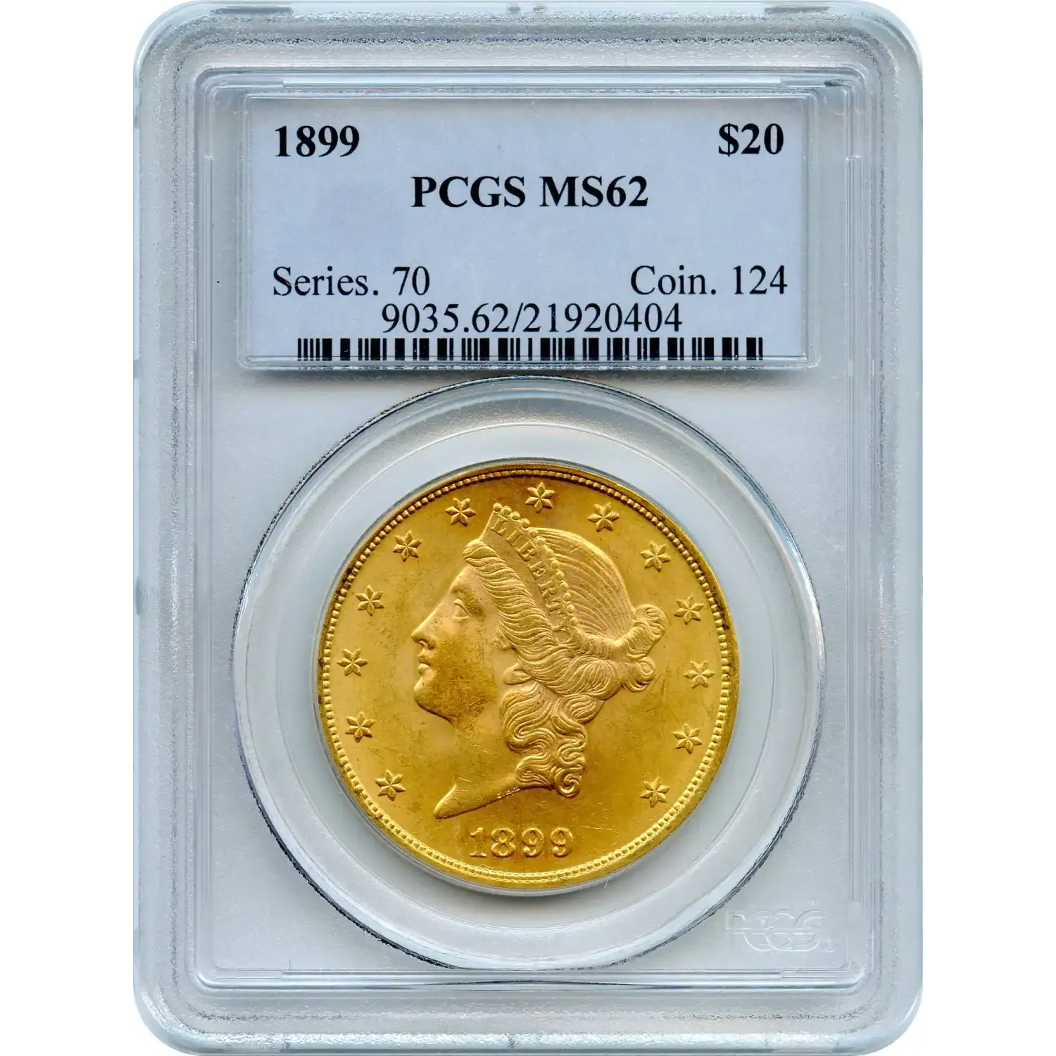 The 1899 $20 Liberty Head Double Eagle was struck at the Philadelphia Mint with a mintage of just under 1.7 million pieces, reflecting the abundant gold supply from ongoing mining operations in the late 19th century. PCGS has graded 10,746 in MS62 with 9,696 finer.