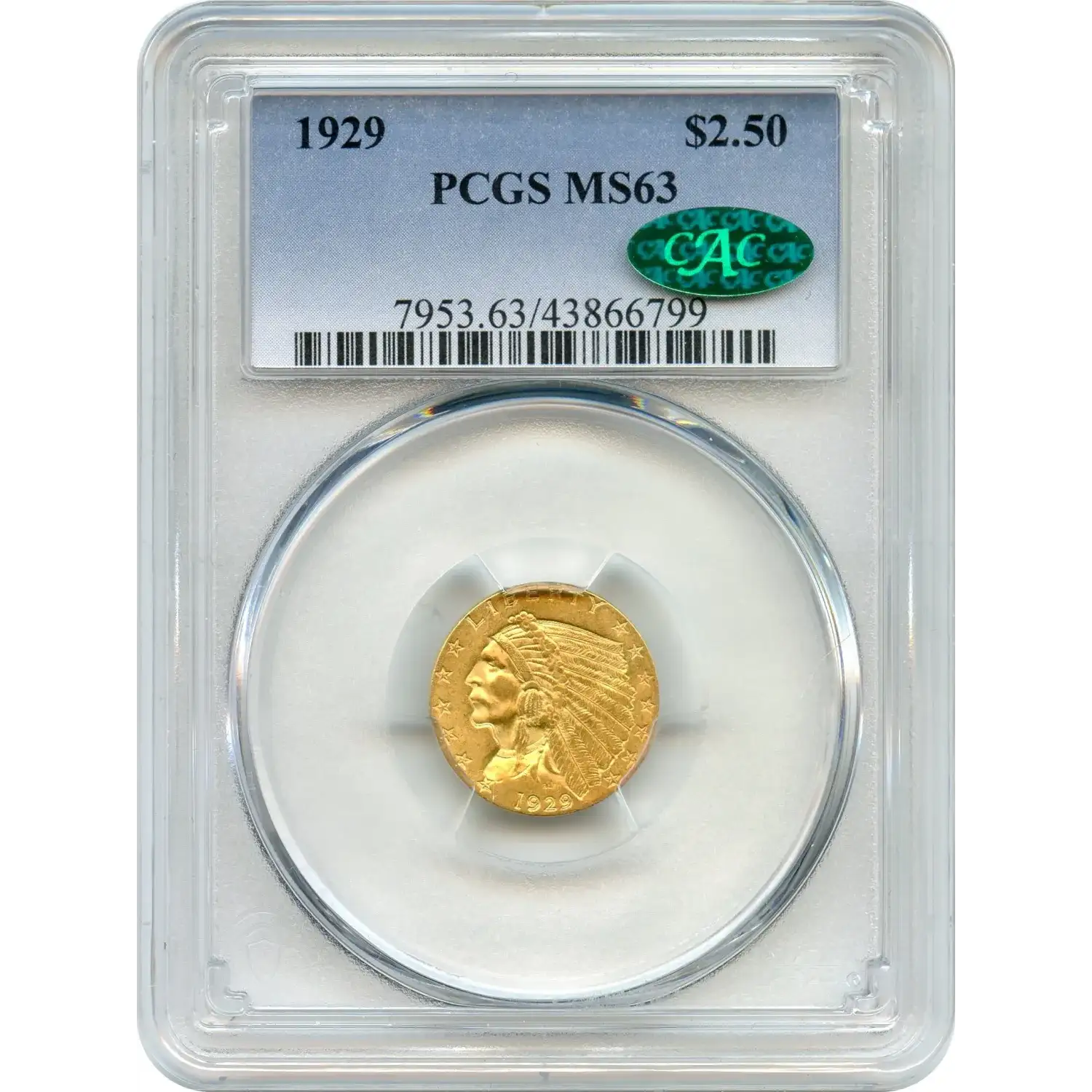 The CAC endorsement on this PCGS MS-63 example indicates quality within the grade, as well as originality and solid overall eye appeal. As a late-date representative of the Indian Head quarter eagle series, the 1929 issue illustrates both the artistic ambitions of early 20th-century U.S. coinage and the closing chapter of circulating gold before the economic disruptions of the early 1930s.