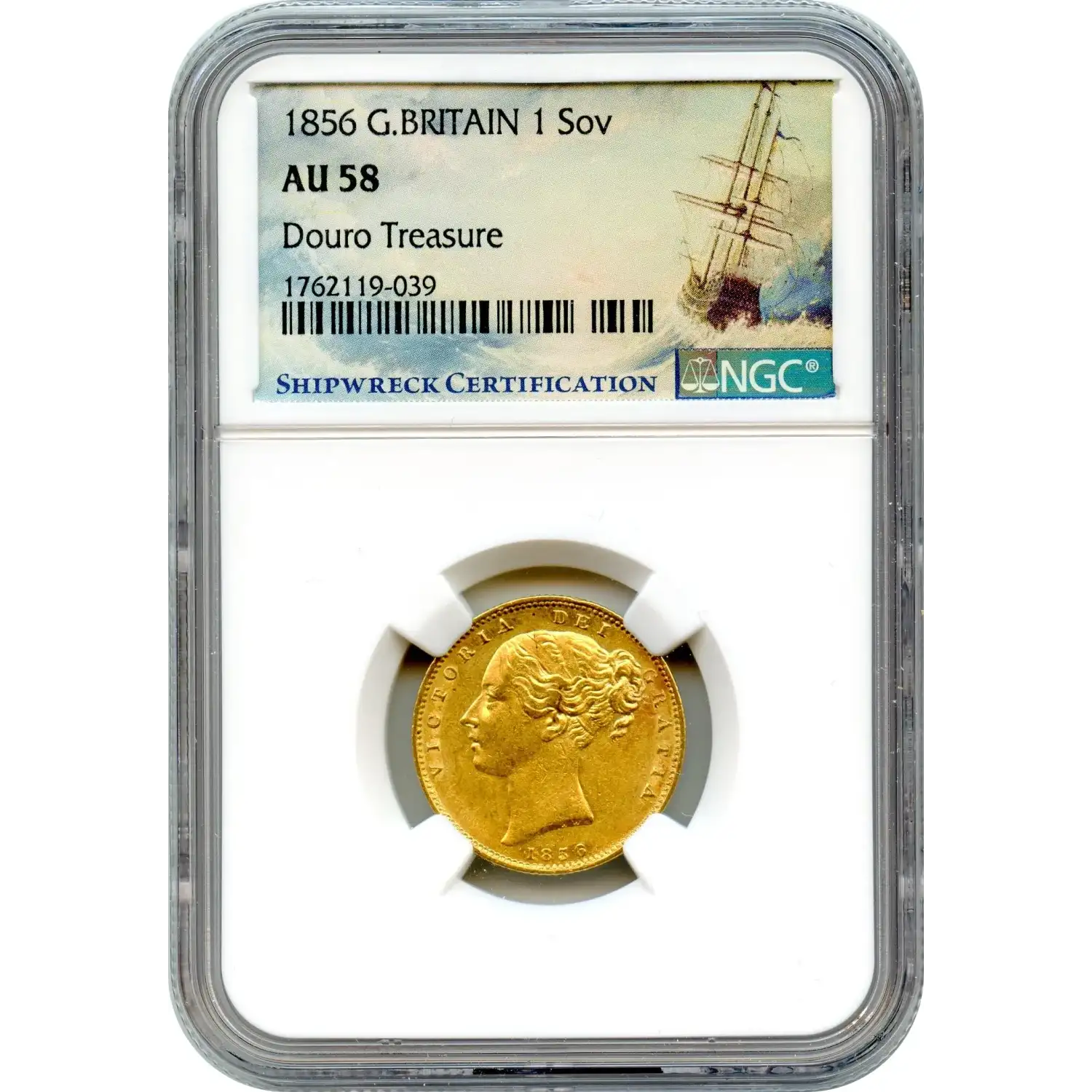 Struck during Queen Victoria’s reign, the Large Date variety reflects subtle changes in mid-century mint engraving, with bolder numerals that distinguish it from other 1856 issues. Graded NGC AU58, the coin retains much of its original detail while showing light circulation that reinforces its authenticity as a working sovereign, not a preserved presentation piece.