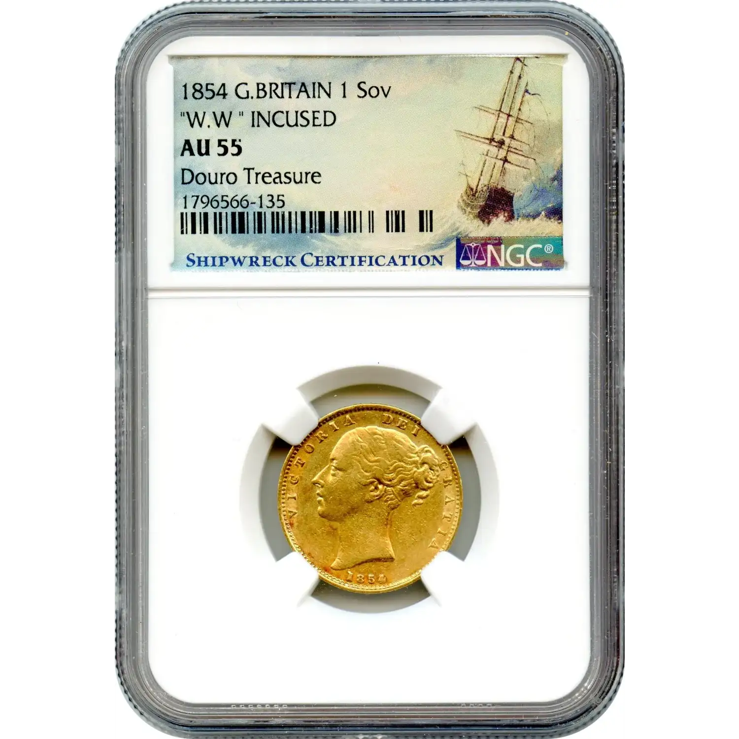 Graded AU55, the piece balances visible circulation with strong original detail, reinforcing its narrative authenticity. This is not merely a representative sovereign, but an artifact that bridges mint, ocean, and history, preserving a story few British gold coins can claim.
