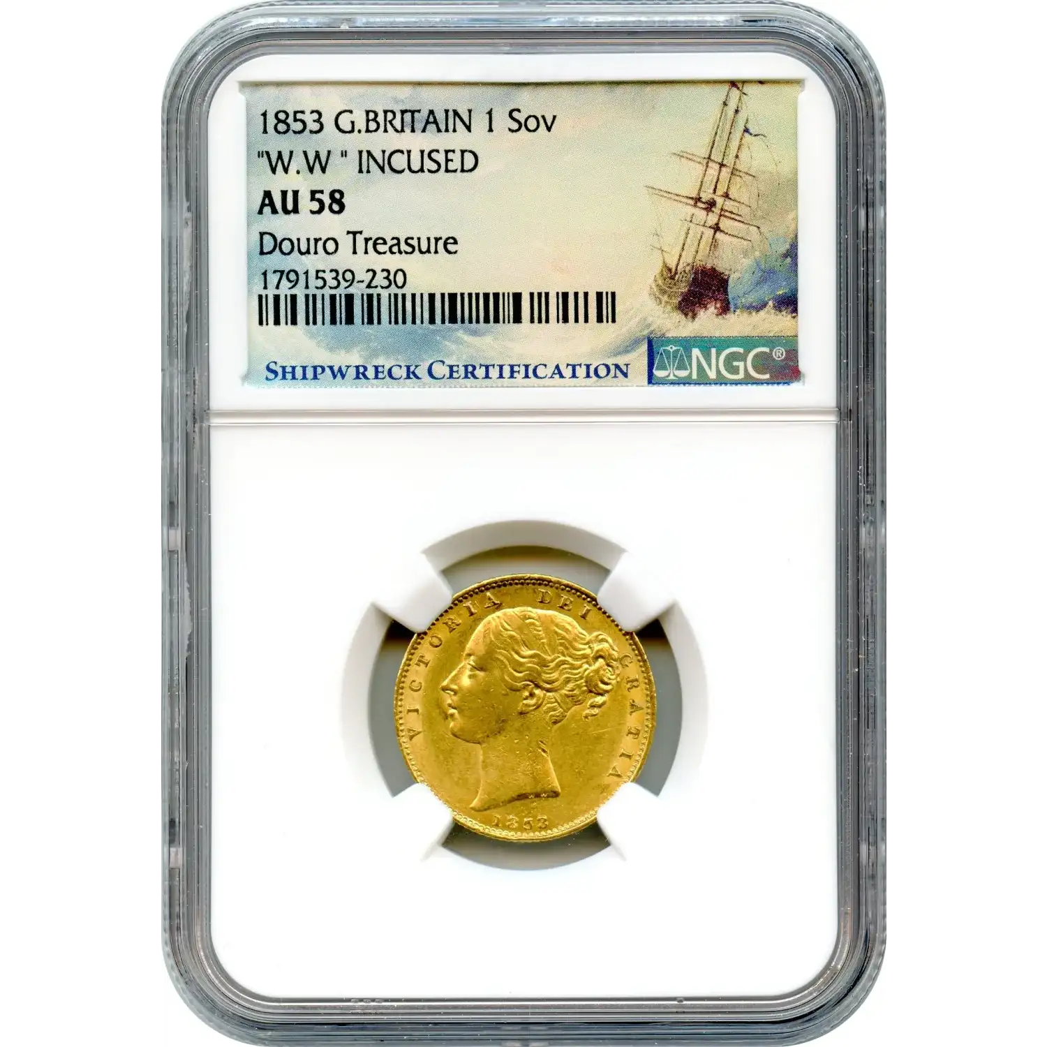 Its greater distinction, however, lies beneath the surfaces. Recovered from the wreck of the RMS Douro, lost off the coast of Spain in 1882, this sovereign is a relic of Britain’s global maritime commerce. Coins like this were not abstractions of wealth; they were working instruments of trade, carried across oceans in strongboxes and pockets, vulnerable to both human error and the sea itself.