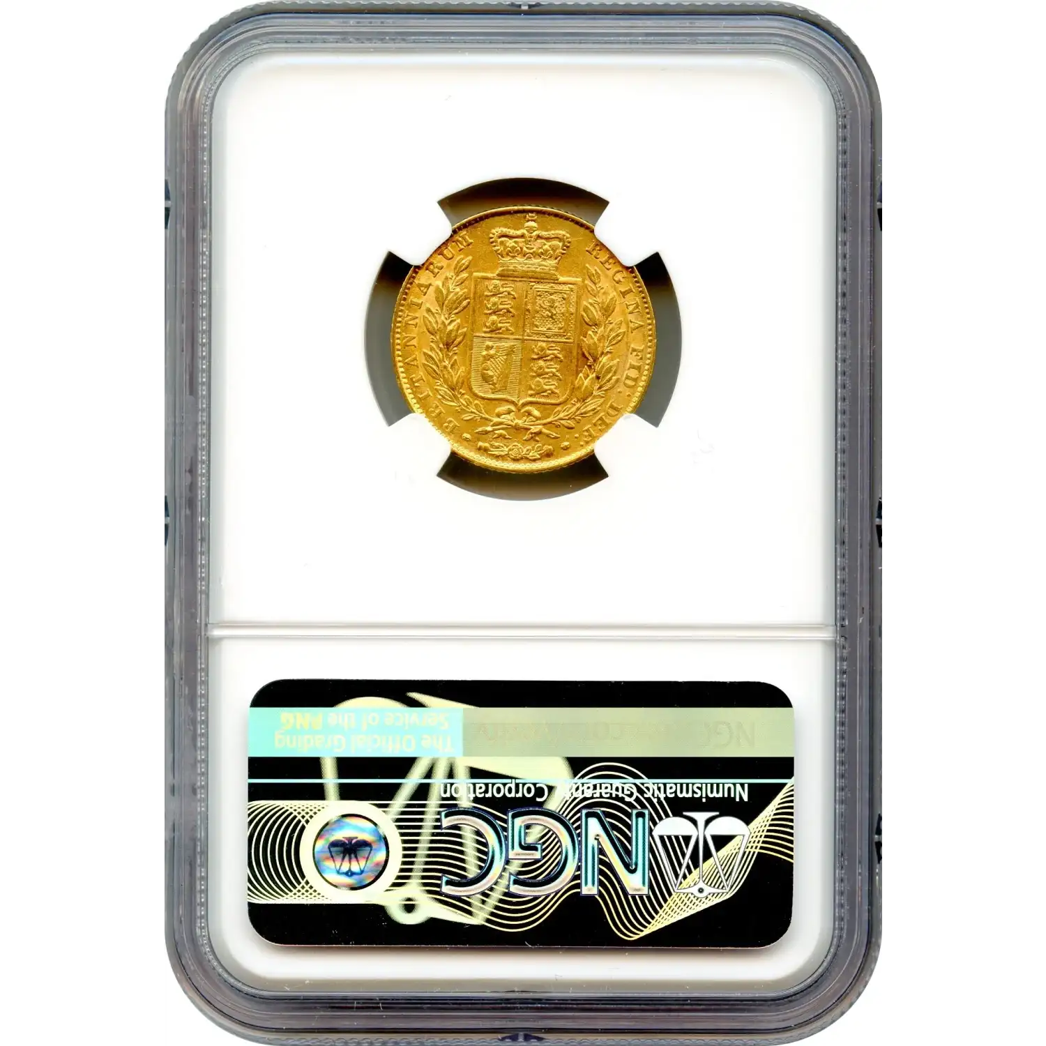 The reverse features the distinctive Broad Shield design, a short-lived type of the coat of arms of Great Britain. Its bold, symmetrical shield gives the coin a formal, almost medallic presence, reflecting a conscious nod to Britain’s constitutional identity and historic continuity. This reverse sets the piece apart from most sovereigns encountered by collectors.