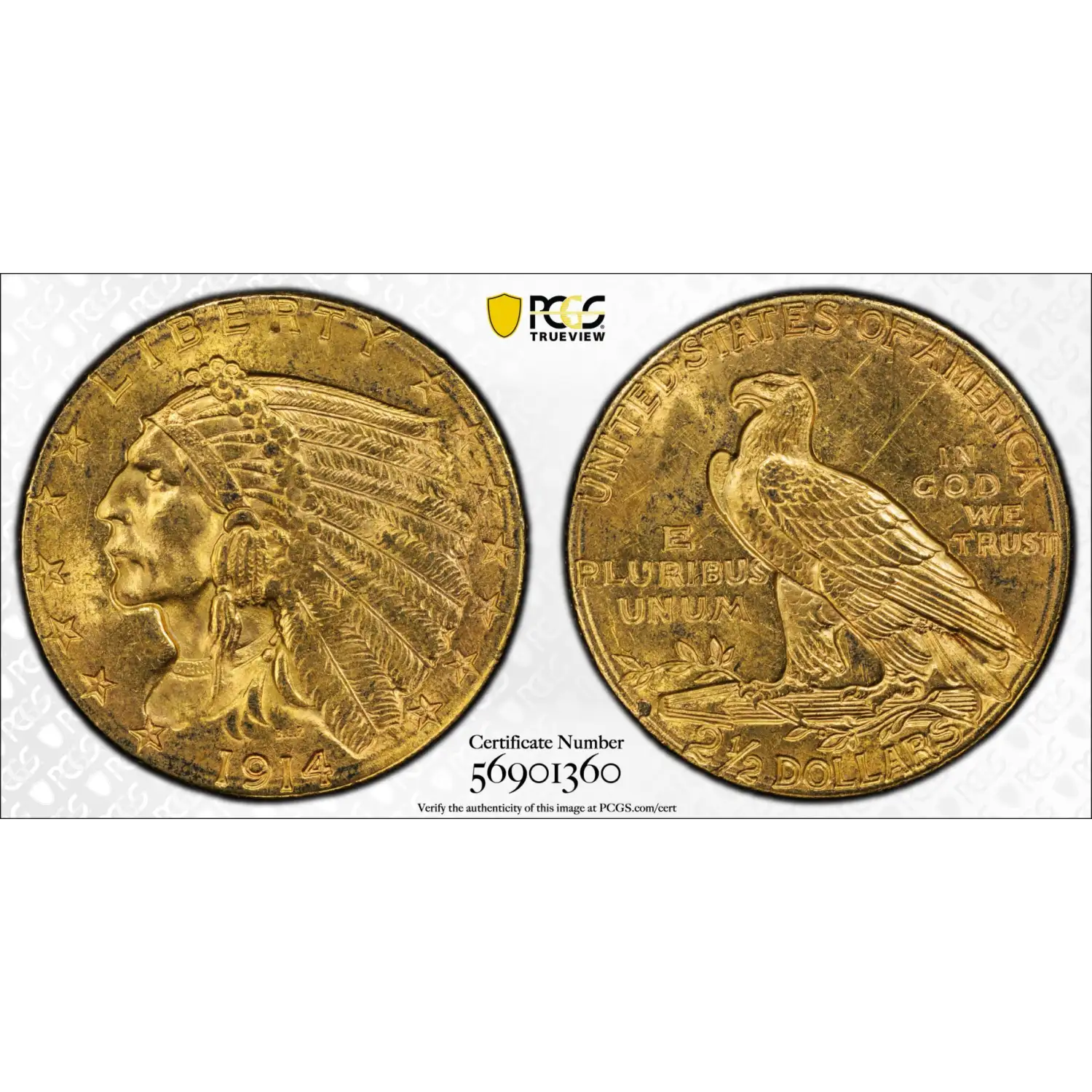 The 1914-D $2.50 Indian Head Quarter Eagle belongs to Bela Lyon Pratt’s revolutionary incuse gold series, a design that broke sharply from traditional raised relief. Pratt’s recessed devices—showing an American Indian in a feathered headdress on the obverse and a powerful standing eagle on the reverse—gave the coin a sculptural, medal-like character that was both modern and distinctly American. Struck at the Denver Mint, the coin reflects the robust Western gold production of the era.