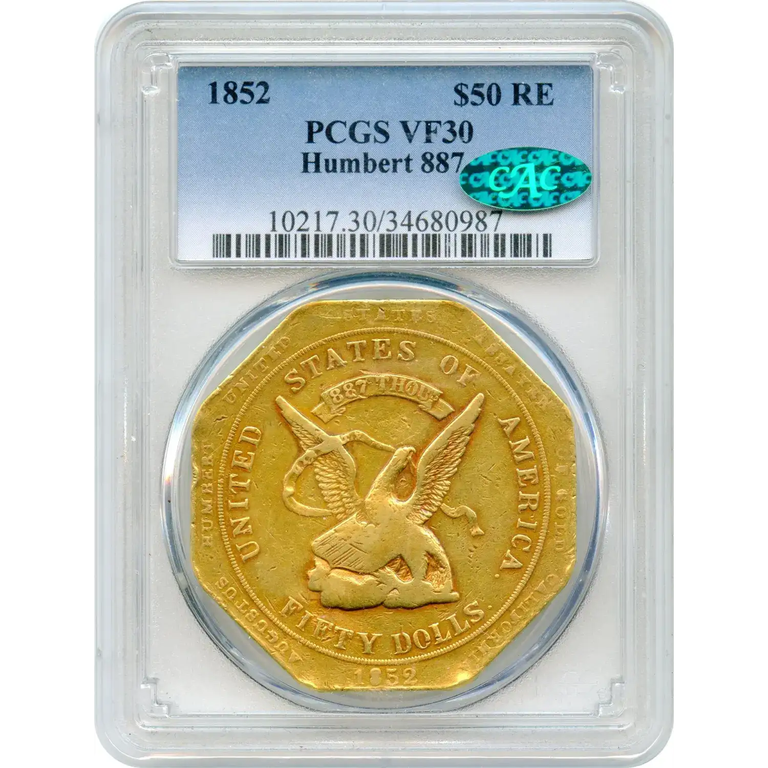 The 1852 Territorial Gold $50 Augustus Humbert “887” Assayer issue is among the most iconic products of Gold Rush–era California. Struck privately under federal authorization, these massive octagonal pieces bridged the gap between raw gold bullion and a stable monetary system. Humbert’s bold design and prominent denomination reflect the urgency of commerce in a gold-rich but coin-poor frontier economy.