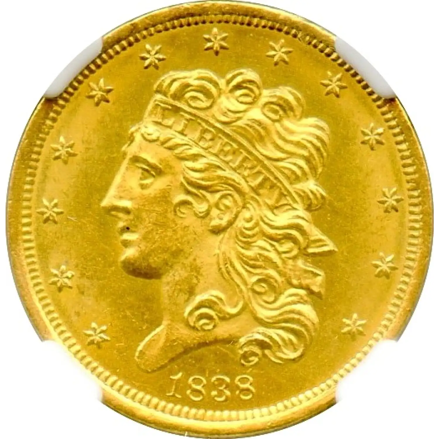 Minted at the Philadelphia Mint in the final year of the Classic Head series (designed by William Kneass), this coin features Liberty wearing a coronet inscribed "LIBERTY" on the obverse and a classic heraldic eagle on the reverse. With a mintage of 286,588 pieces, the 1838 is relatively available in circulated grades, yet examples with documented shipwreck provenance are exceedingly rare and highly desirable among advanced collectors.