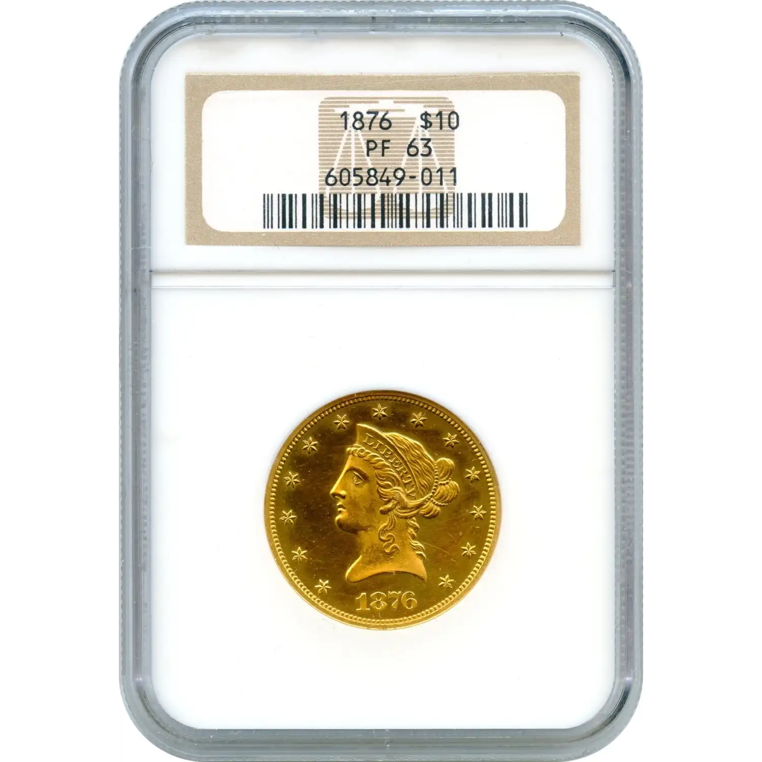 In terms of certification, NGC has graded just a single example of the 1876 proof $10 Eagle as PF-63, with none graded finer. This population data underscores the extraordinary scarcity of the issue and places the coin among the most elusive proof gold eagles of the 19th century.