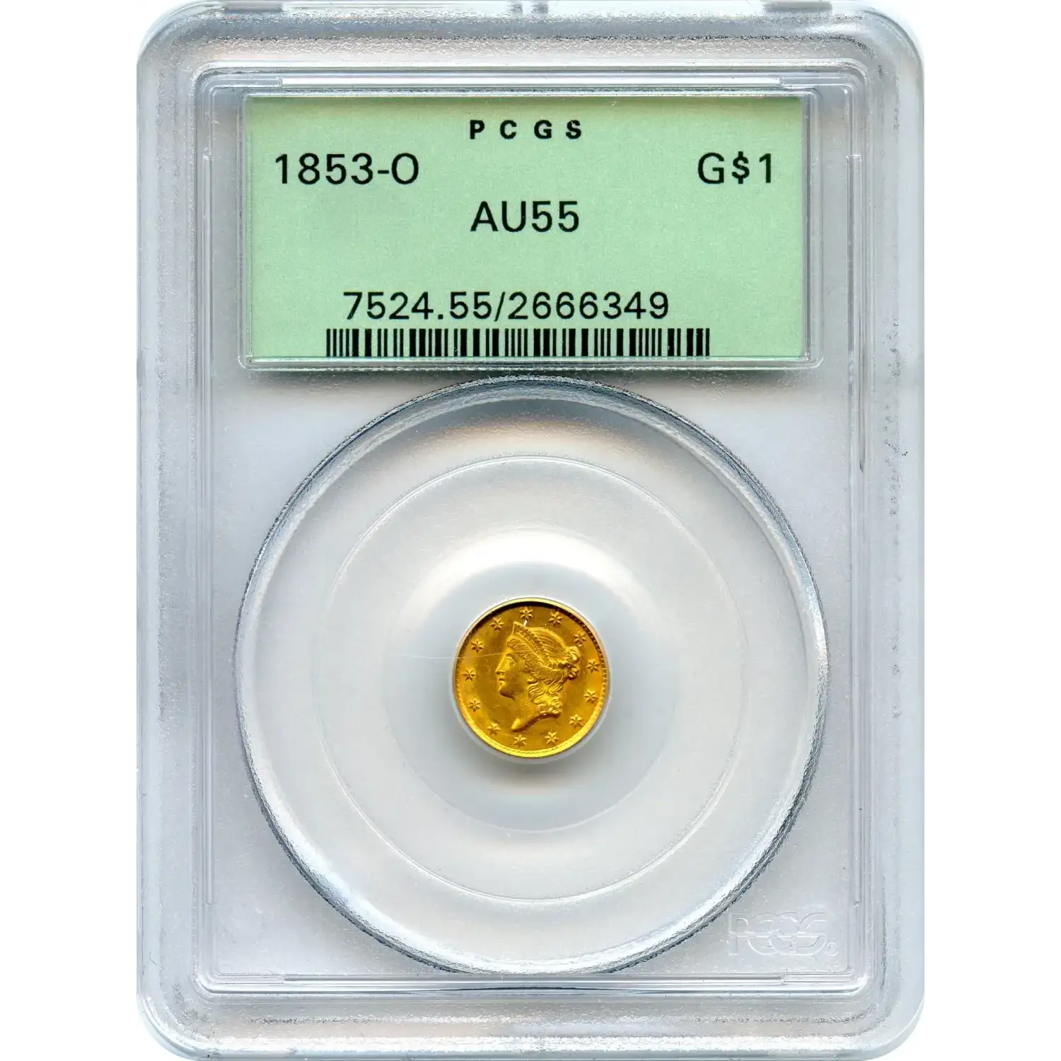 The 1853-O $1 Liberty Head Gold Dollar, Type 1, is a distinctive Southern gold issue struck at the New Orleans Mint during the early years of the denomination. Designed by James B. Longacre, the petite gold dollar features the small Liberty head portrait that defines the Type 1 series, produced from 1849 through 1854.