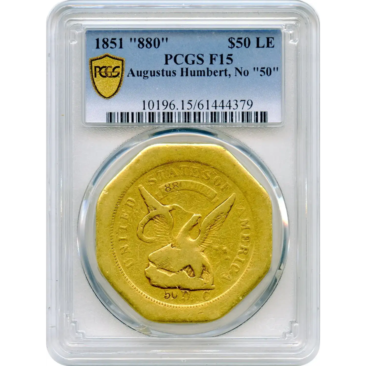 The 1851 Territorial Gold “880” $50 Augustus Humbert "Lettered Edge" issue represents one of the most evocative products of the early California Gold Rush. Struck under the authority of U.S. Assayer Augustus Humbert, these massive gold pieces were created to bring order and trust to a chaotic bullion economy, when raw gold dust and private ingots dominated commerce. The boldly stamped “880” fineness reflects the practical realities of frontier assaying in 1851.