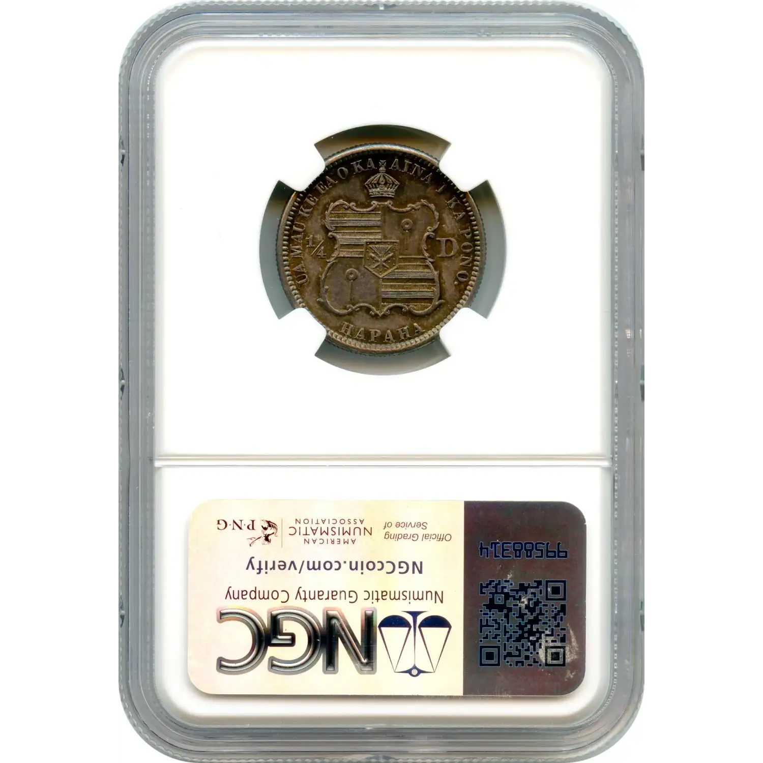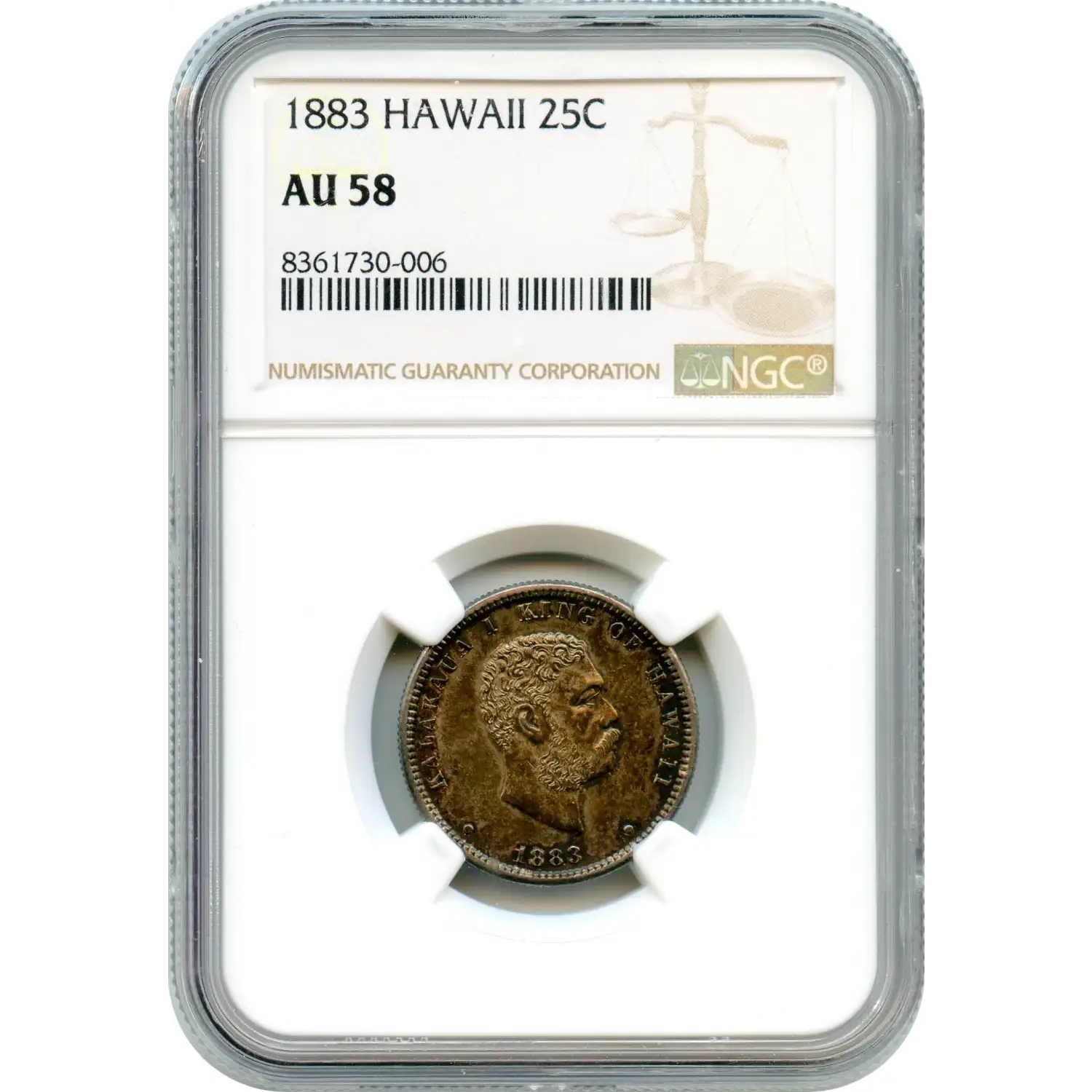 The 1883 Hawaiian Quarter Dollar was produced during the reign of King Kalākaua. Issued in 1883, the coin reflects the monarchy’s effort to assert monetary independence while still aligning its coinage with United States standards, a practical necessity in an economy dominated by American trade and influence. NGC has graded 171 as AU58 with 1,228 finer.