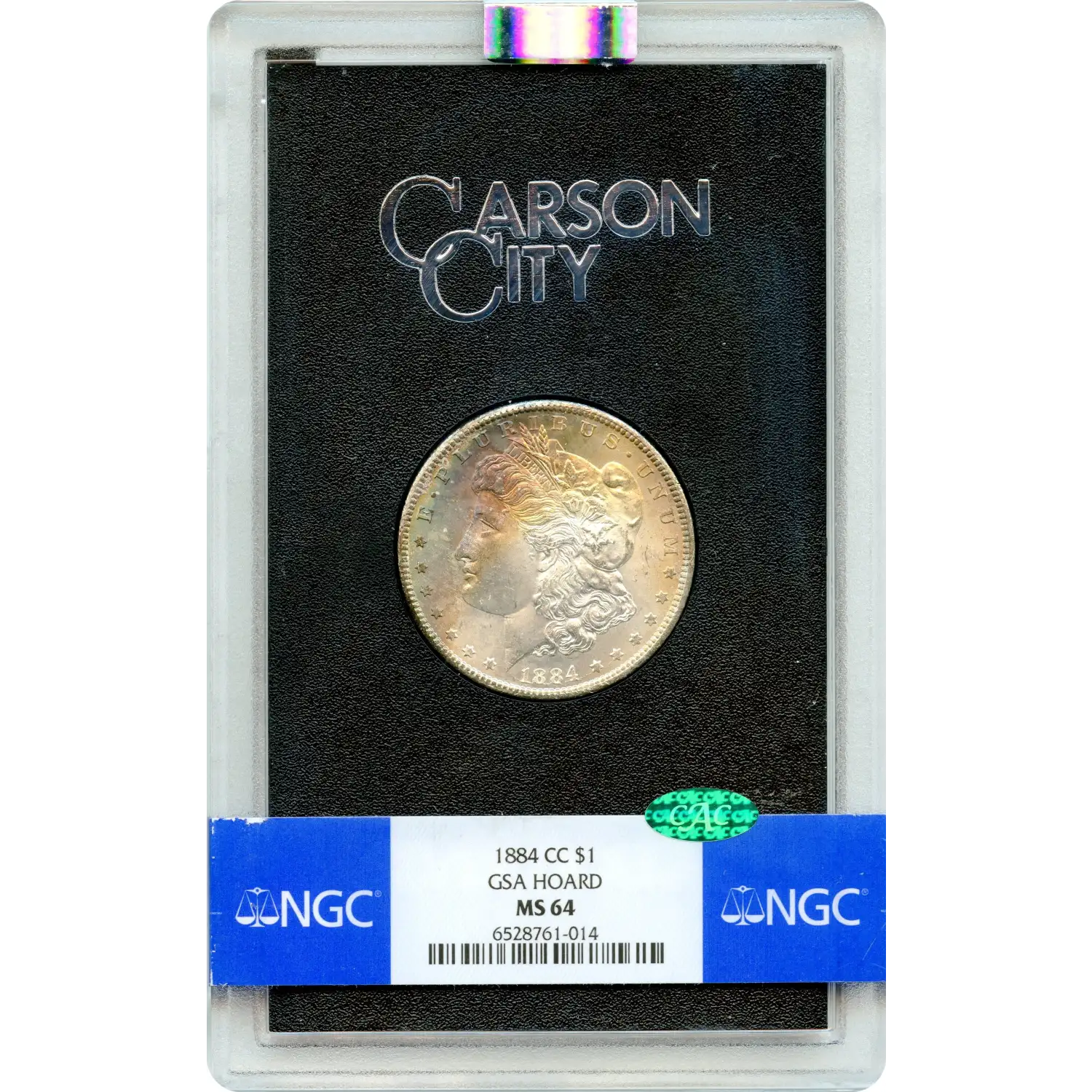 The 1884-CC Morgan Silver Dollar is among the most plentiful issues from Carson City, owing to its long storage and eventual release in the GSA Hoard. This example, certified NGC MS-64 GSA Hoard CAC, reflects that history while still offering notable visual appeal. NGC has graded 15,339 pieces at the MS64 level, with 8,861 finer, underscoring its availability in high grade.