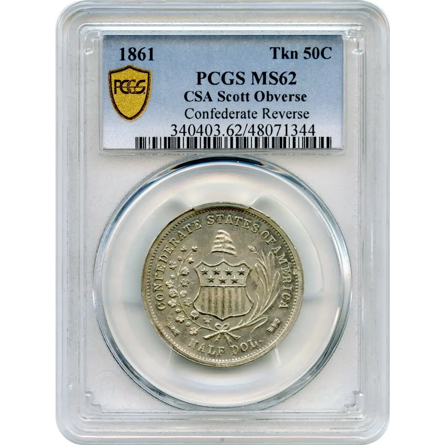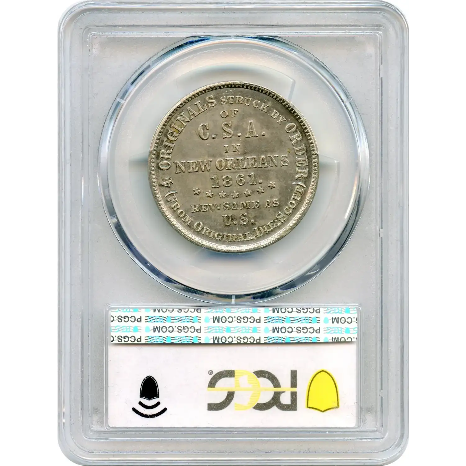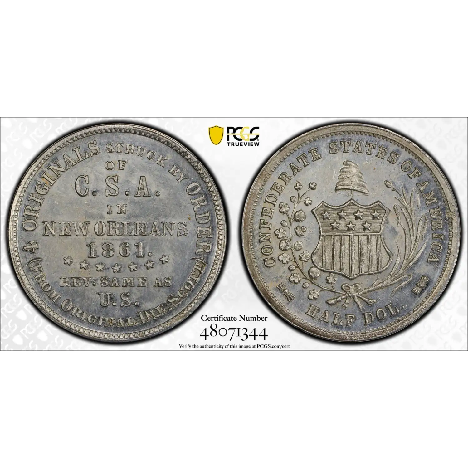 The inscription reads: “Originals Struck by Order of C.S.A. in New Orleans 1861. Rev. Same as U.S. (From Original Die: Scott).” This text was intentionally added to clearly distinguish the restrikes from coins struck during the Civil War, while still emphasizing their connection to the original Confederate half dollars.