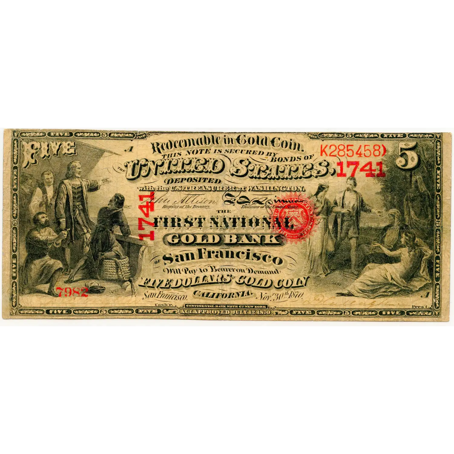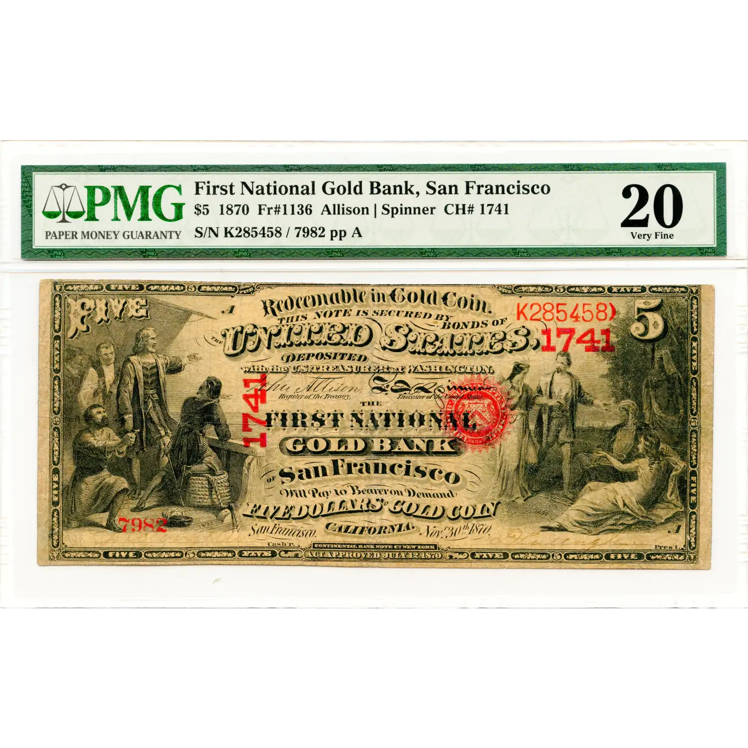 This exceptional National Gold Bank Note, graded Very Fine 20 by PMG with minor restoration, hails from the First National Gold Bank of San Francisco (Charter #1741), the pioneering California institution chartered on November 30, 1870. As one of the finer survivors from this short-lived series (1870s–early 1880s), it boasts vibrant coloration, sharp detail, and superior eye appeal for its grade.