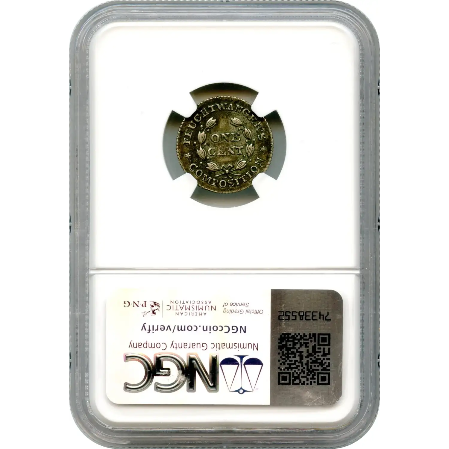 Unlike traditional copper cents, this token was produced in what was known as “German silver,” or argentan—a white metal alloy developed as a less expensive alternative to copper. The alloy, composed primarily of nickel, copper, zinc, tin, and trace metals, gave the pieces a lighter appearance and greater hardness. Feuchtwanger promoted this composition as durable and well suited for circulation, anticipating later federal interest in nickel-based coinage.