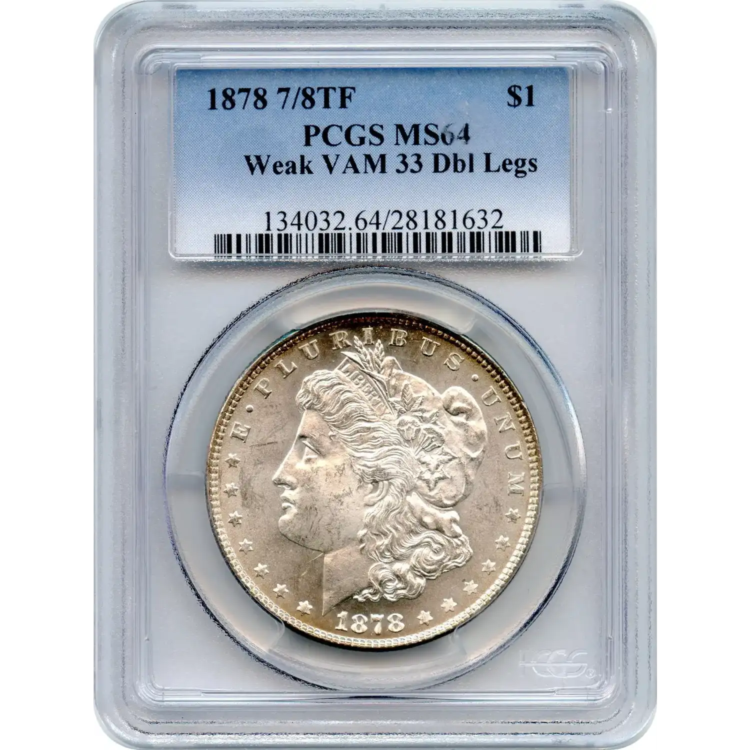 This example features the 7 Tail feather obverse paired with the Reverse of 1878, an early and short-lived configuration distinguished by its parallel arrow feather tips and distinctive eagle style. Adding further interest is the VAM-33 attribution, known as the Doubled Legs variety, where clear doubling is visible on the eagle’s legs beneath the tail feathers. This dramatic die variety is among the most recognizable of the first-year Morgans.