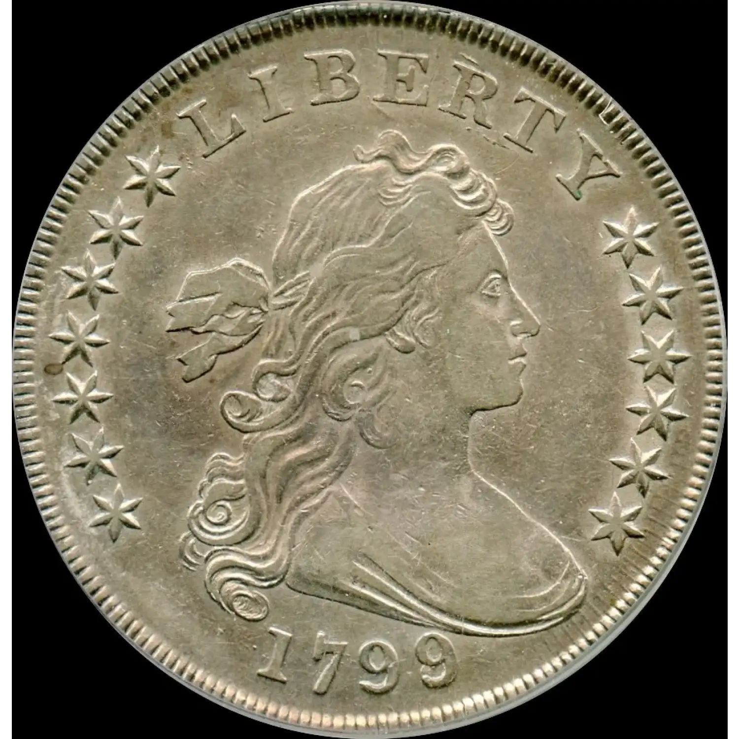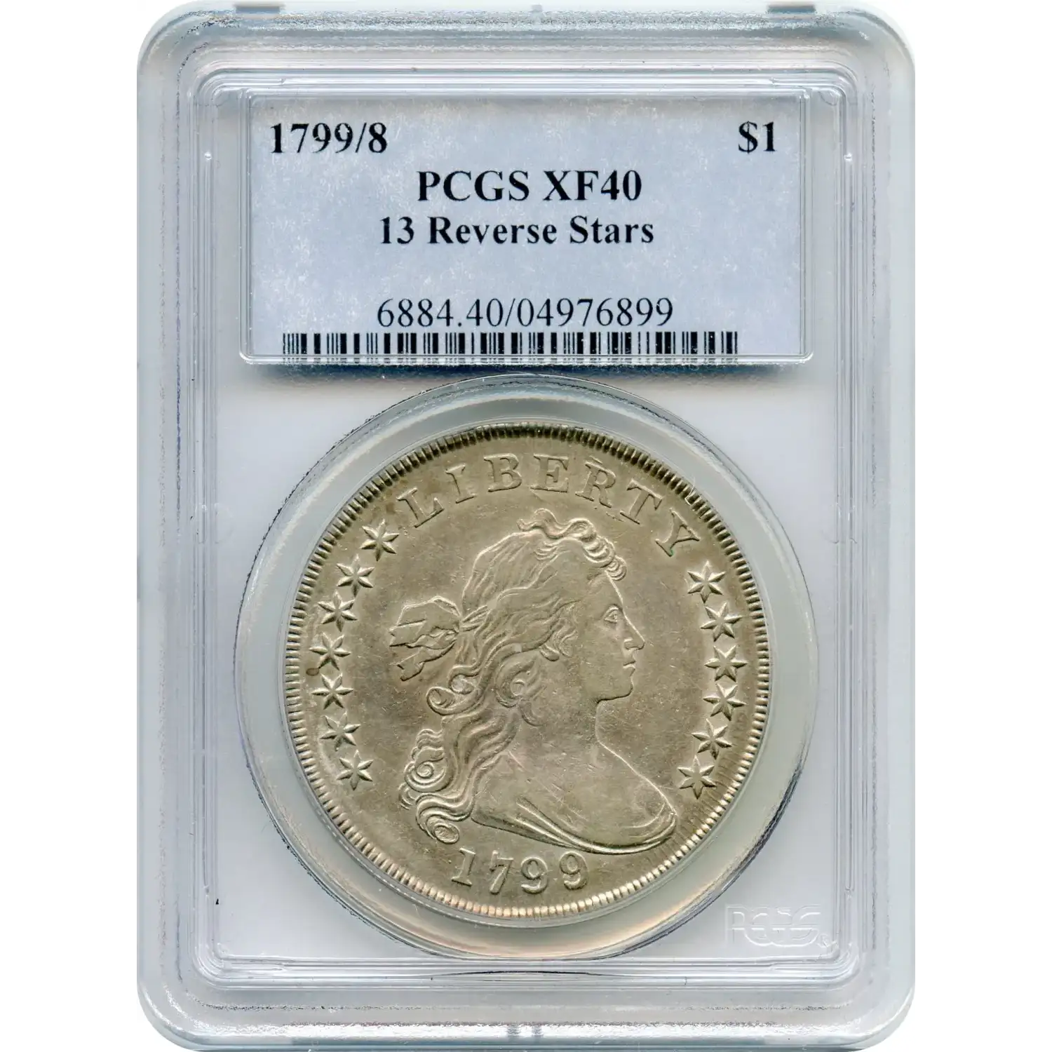 This is, in fact, a 1799/8 $1 Draped Bust Silver Dollar also known as BB-141, with 15 reverse stars. To quote our client (SS) he states "...This is the 15 star reverse. Stars 14 and 15 are barely peeking out from the first and last clouds. The middle row of stars on this reverse has six stars while the 13 star reverse has five stars in the second row. This is well struck with nice detail in the centers of several of the obverse stars." Couldn't have said it any better...! (We will endeavor to resbmit to PCGS under the Mechanical Error option).| Product ID | 557627 |