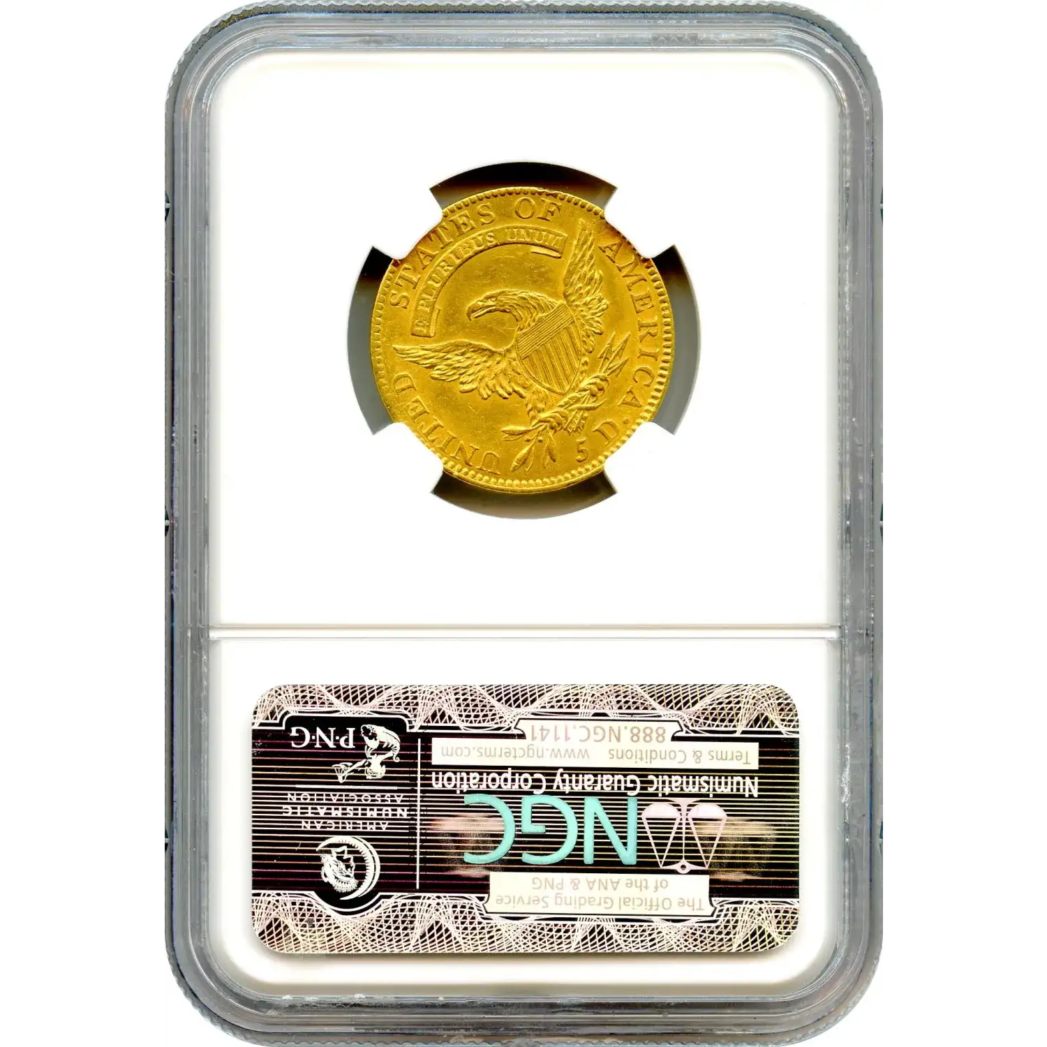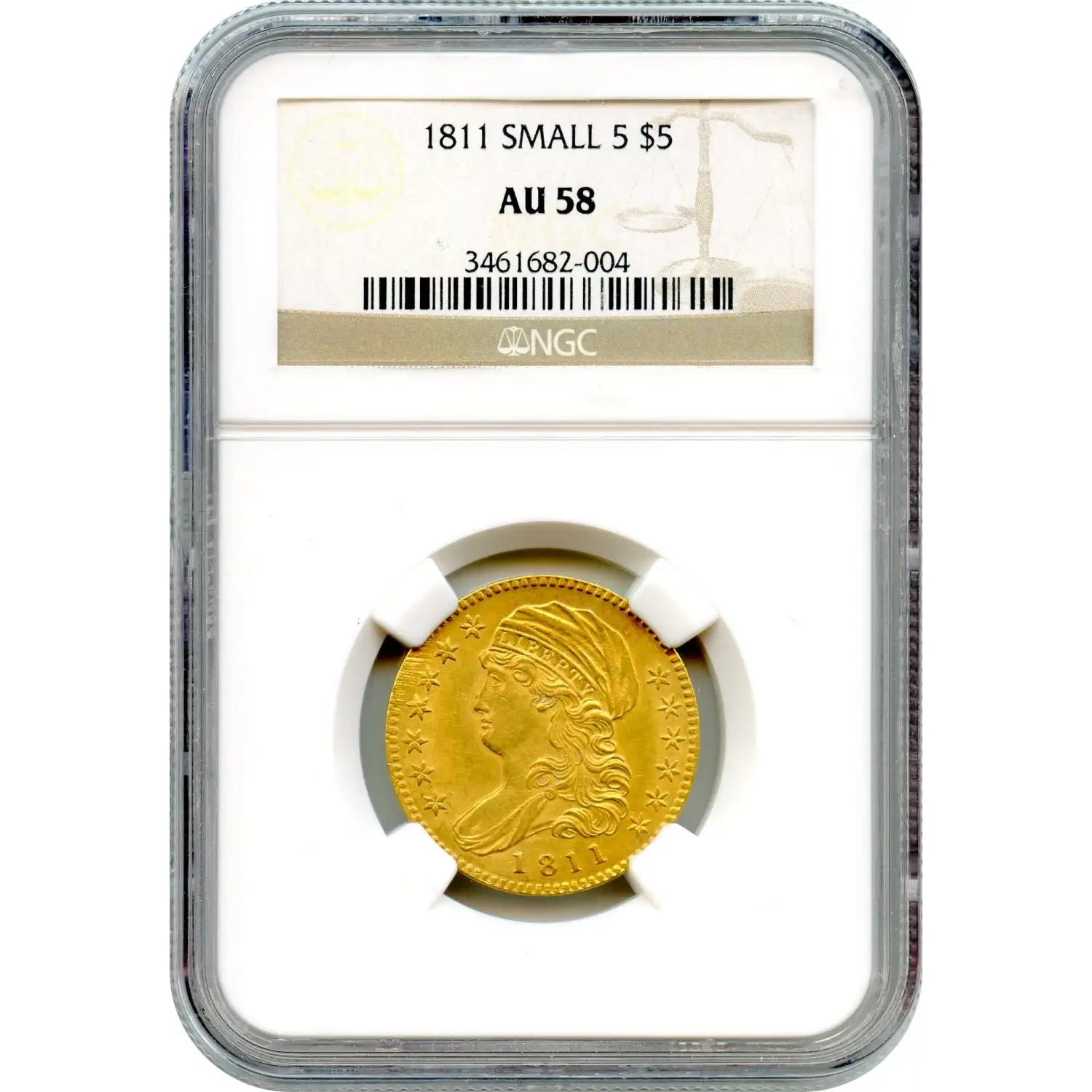 Nearly 100,000 half eagles were minted in 1811, split evenly between the Large 5 (BD-1) and Small 5 (BD-2) varieties. The Small 5 appears most frequently on the market, especially in Mint State, though certified Uncirculated examples rarely exceed MS-63. Auction archives from the past 15 years show far more Small 5 offerings than Large 5, but few reach Choice or finer grades; only six Gem-level coins have sold since 1993. The Small 5 is identifiable by its diminutive "5" and a repunched base on the "C" in "AMERICA." In the Choice About Uncirculated AU58 grade, NGC has certified 6 examples with 15 finer.