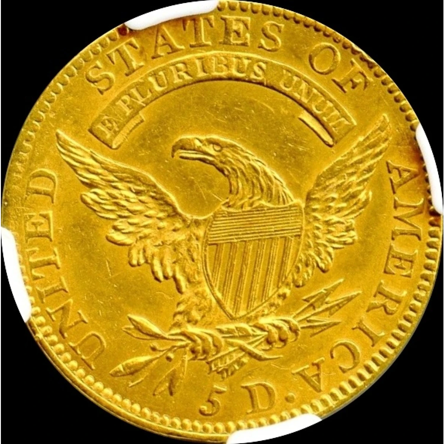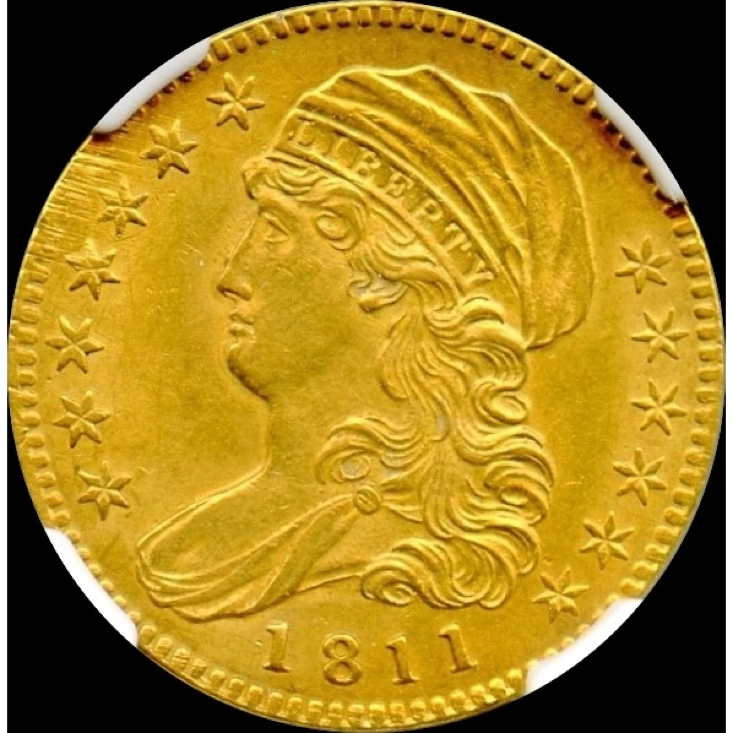 The 1811 half eagle, part of the Capped Bust Left series, features two die varieties (BD-1 and BD-2) that share a single obverse die and are easily distinguished by the size and position of the "5" in the denomination. The BD-1 Tall 5 brushes against the lower denticles, while the BD-2 Small 5 sits evenly centered between the rim and the eagle's lowest fletching. Both varieties are relatively collectible among early half eagles, with John Dannreuther's estimates in Early U.S. Gold Coin Varieties suggesting 175–250 survivors for BD-1 and 225–300 for BD-2, making the latter slightly more accessible. Compared to earlier issues like the 1807, 1809/8, 1810 Large Date/Large 5, and 1812, the 1811 is more challenging to acquire overall.