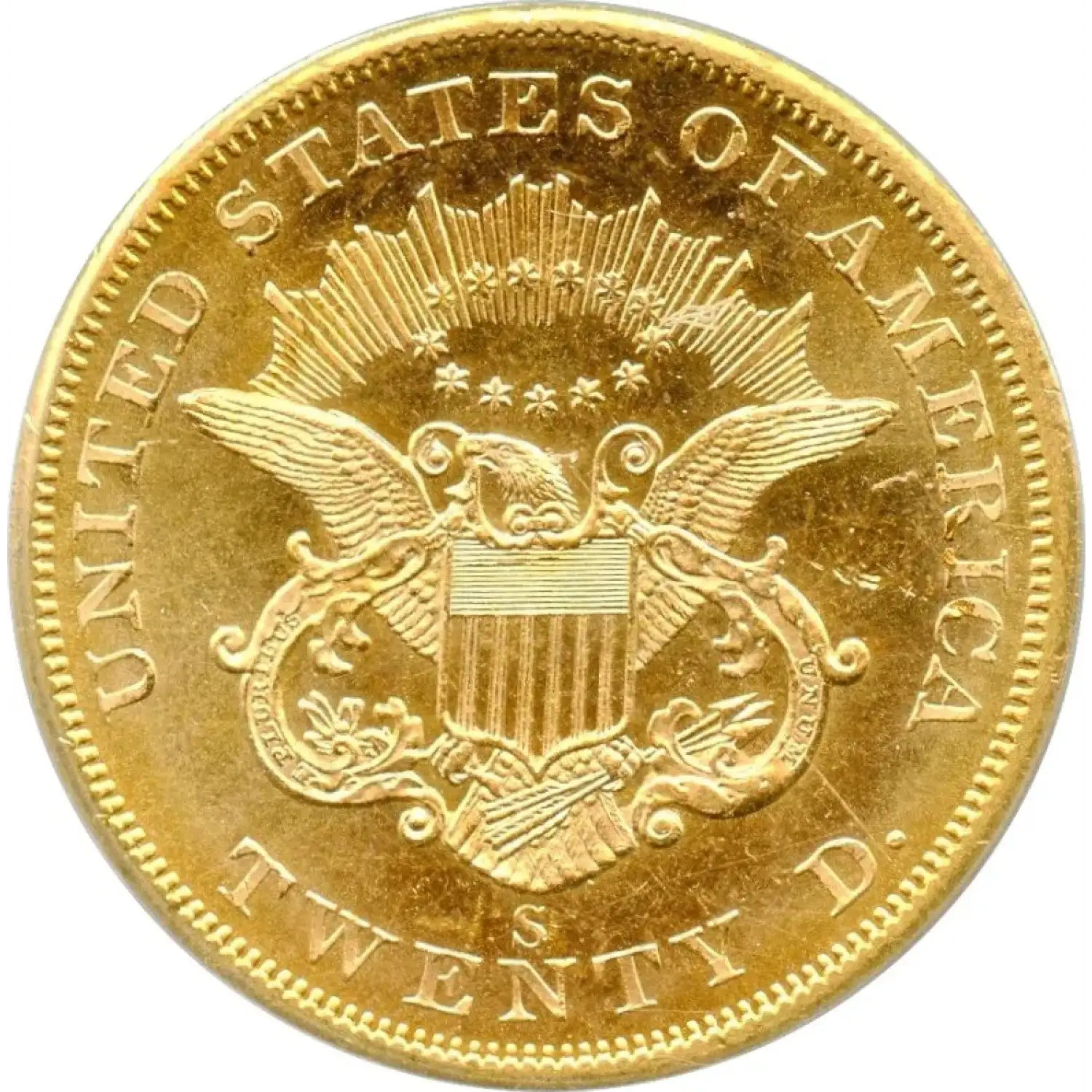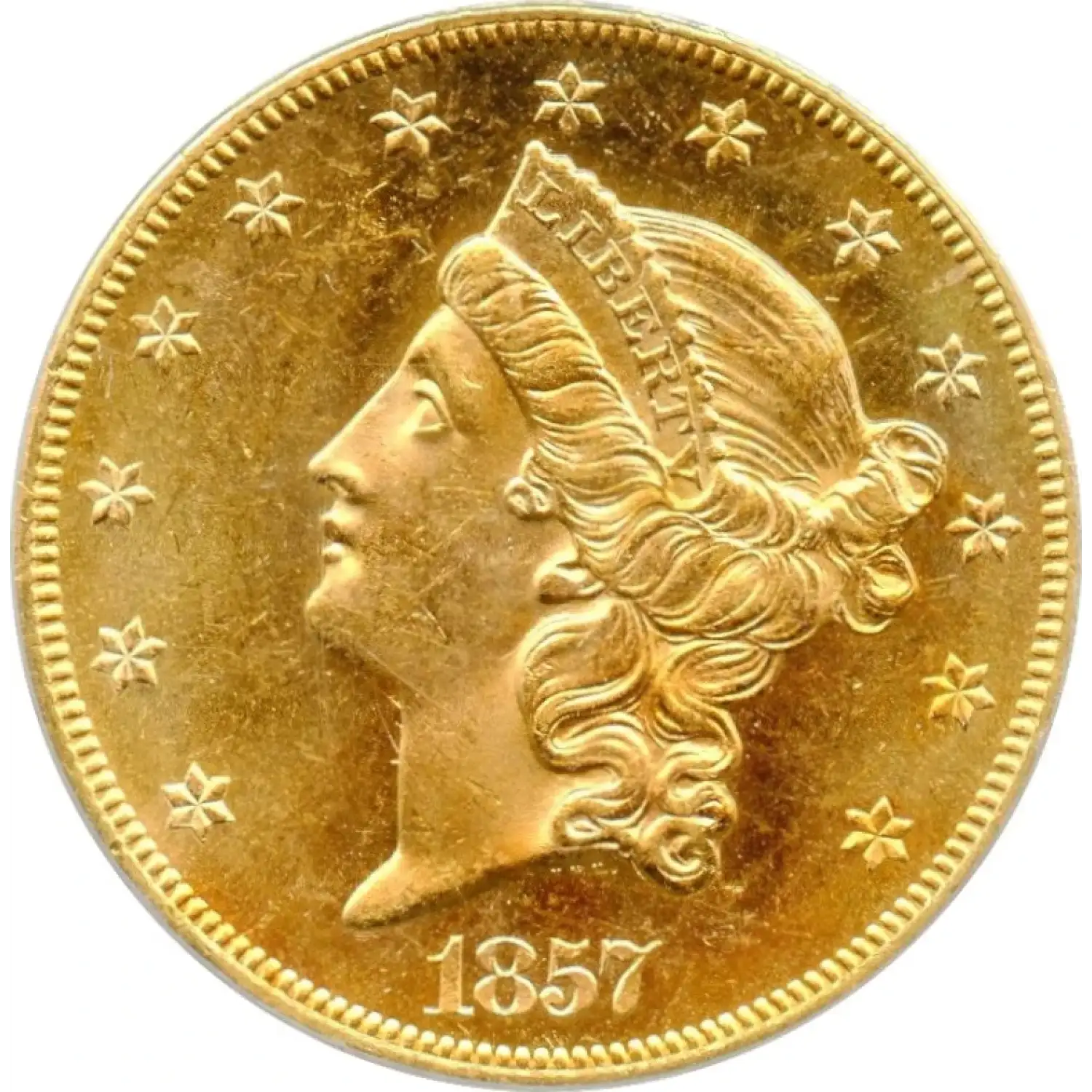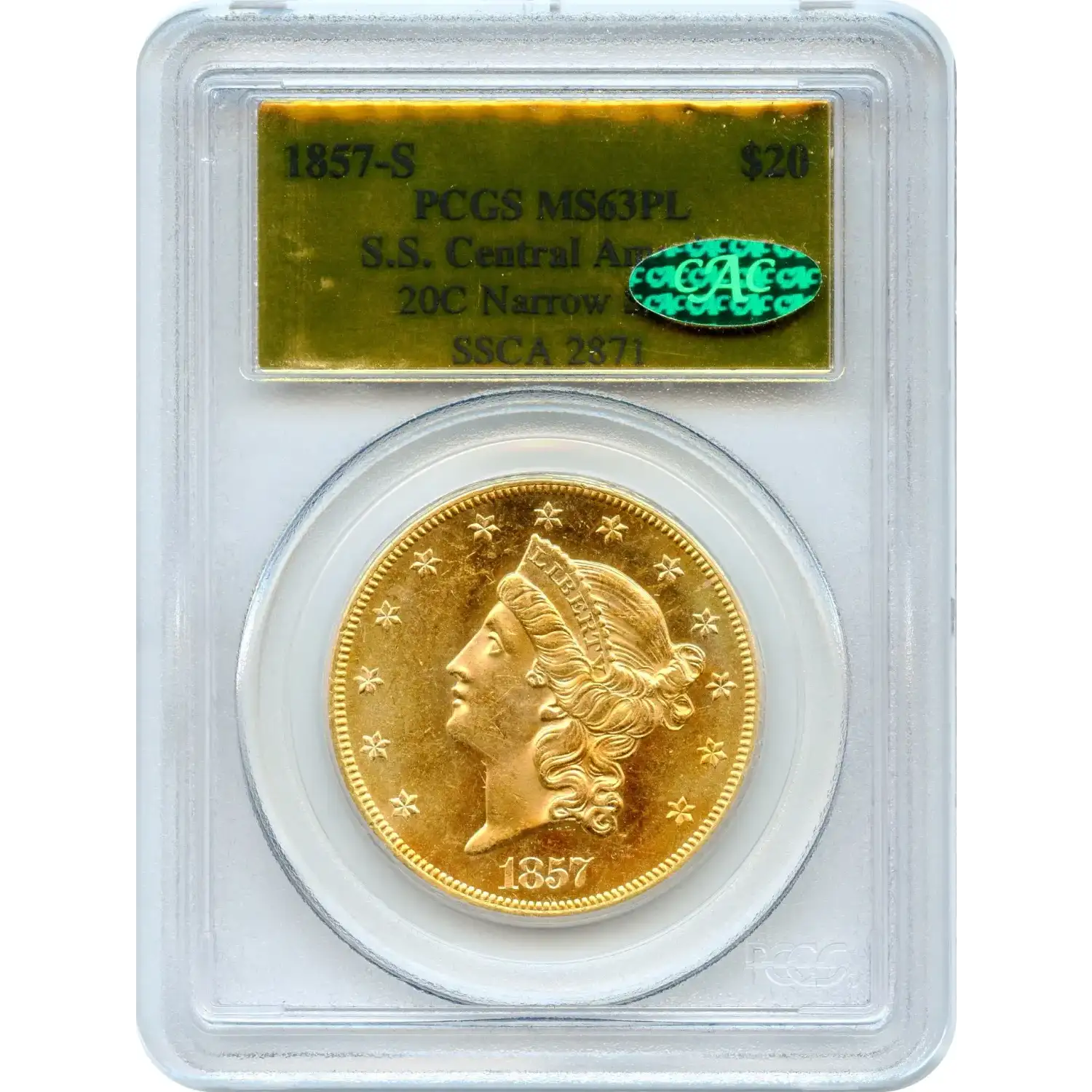 The 1857-S $20 Liberty Head Double Eagle was struck at the San Francisco Mint amid the California Gold Rush. Graded PCGS MS-63, it remains uncirculated, showing full mint luster and crisp strike, as well as stunning prooflike surfaces. The CAC sticker gives it extra value and prestige.