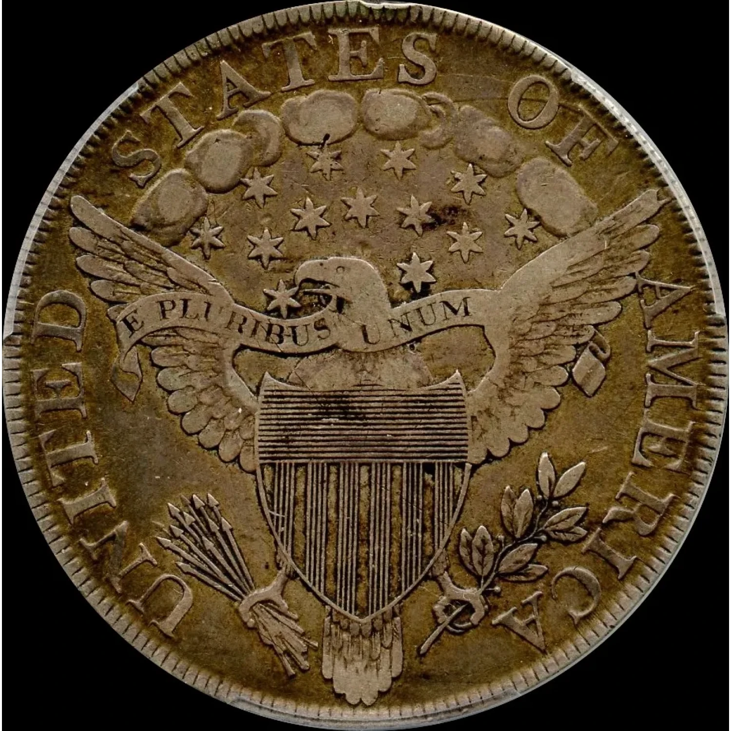 The 1800 Draped Bust dollar in the BB-196, 12 Arrows variety carries a distinctive visual signature that immediately sets it apart within the series. The extra arrows clustered beneath the eagle lend the reverse a denser, more compact appearance, a subtle but appealing feature that has long drawn collector attention. This is a popular variety, appreciated as much for its character as for its place as a variety in the Draped Bust series.