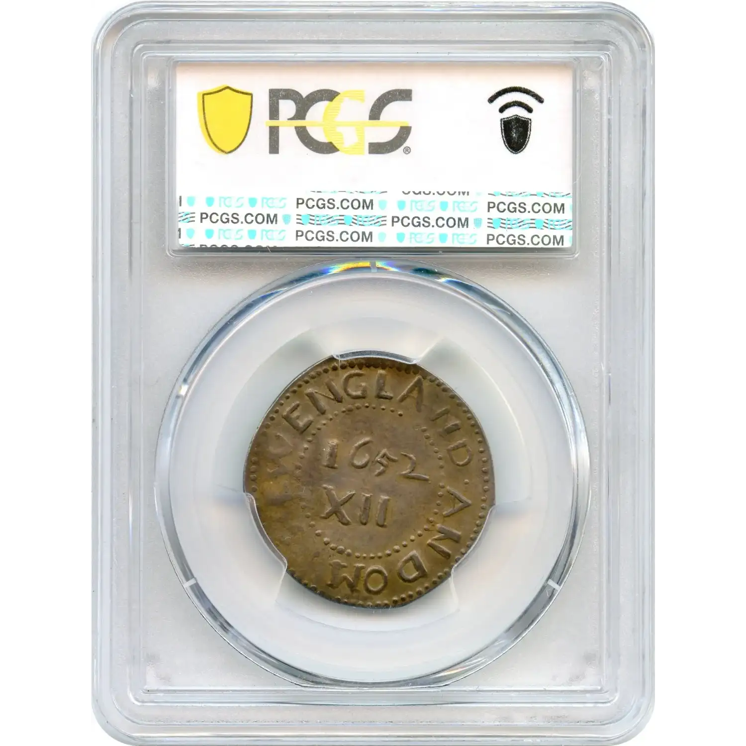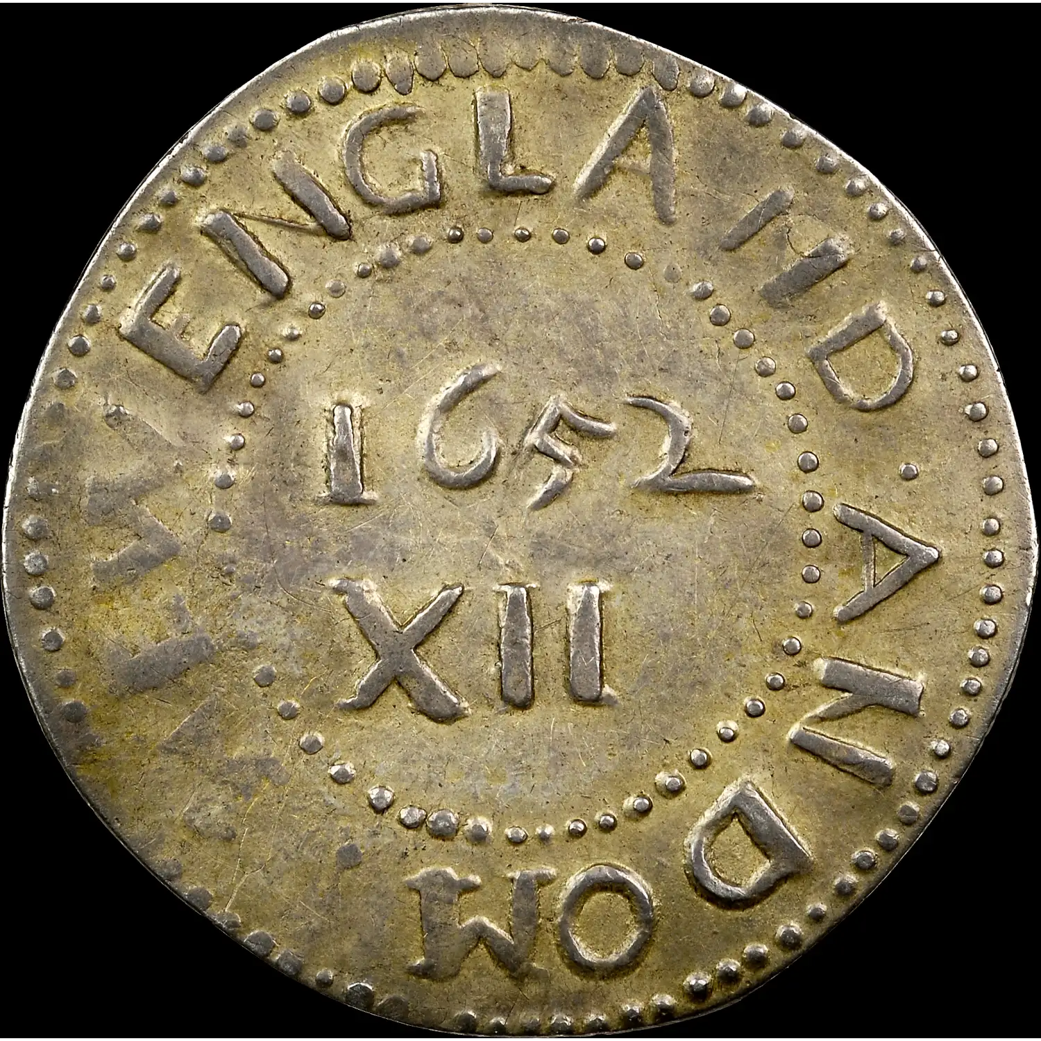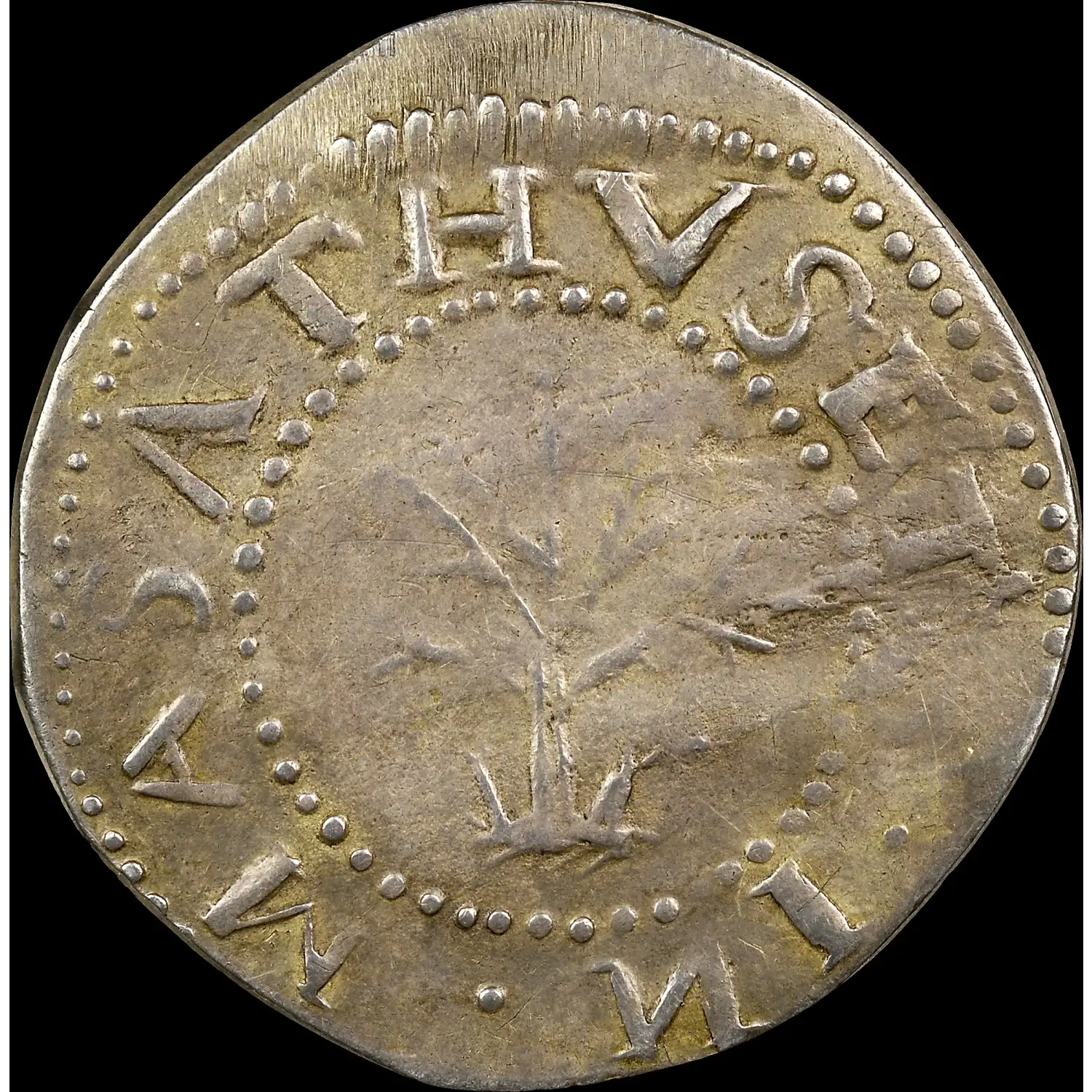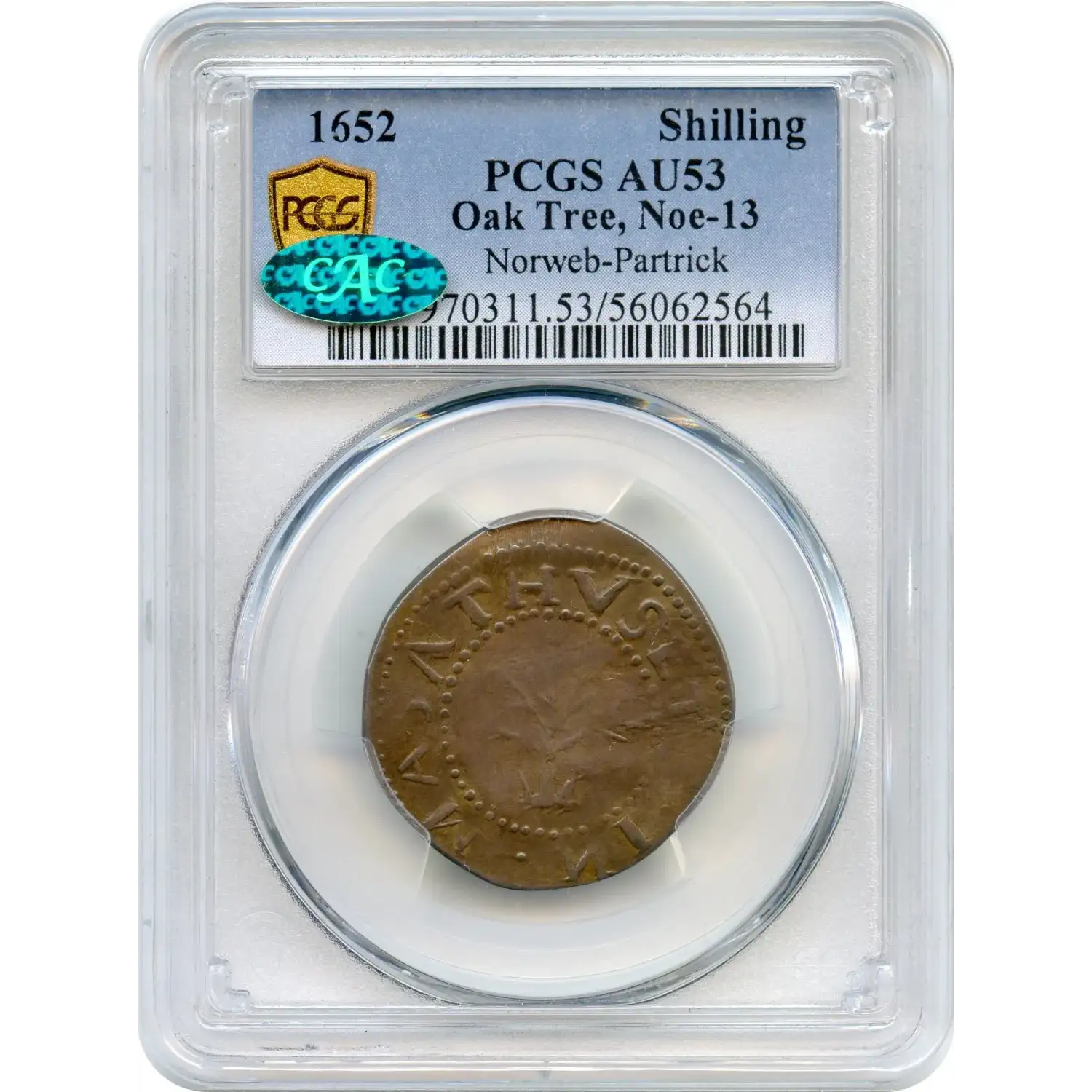 An EXCEPTIONAL OFFERING-!!! 1652 Oak Tree Shilling, "IN" at Bottom. Noe-13.3, W-520, Salmon 10-G, R.6. 70.9 gn. Along with Noe-13.6, this is one of the two intermediate die states of Noe-13. Both were first detailed in 1959 by Eric P. Newman. Die buckling on the central obverse distinguishes Noe-13.3 from Noe-13. The lack of "spines" on the tree, and the shape of the first and second S, separate Noe-13.3 from Noe-13.6. The present chocolate-brown Noe-13.3 shilling has full legends, although NEW and the final S are lightly impressed. No marks are remotely consequential. Minor granularity on the central reverse is as made from die erosion. The eye appeal is excellent, and obtaining a finer example would prove to be a Herculean task.