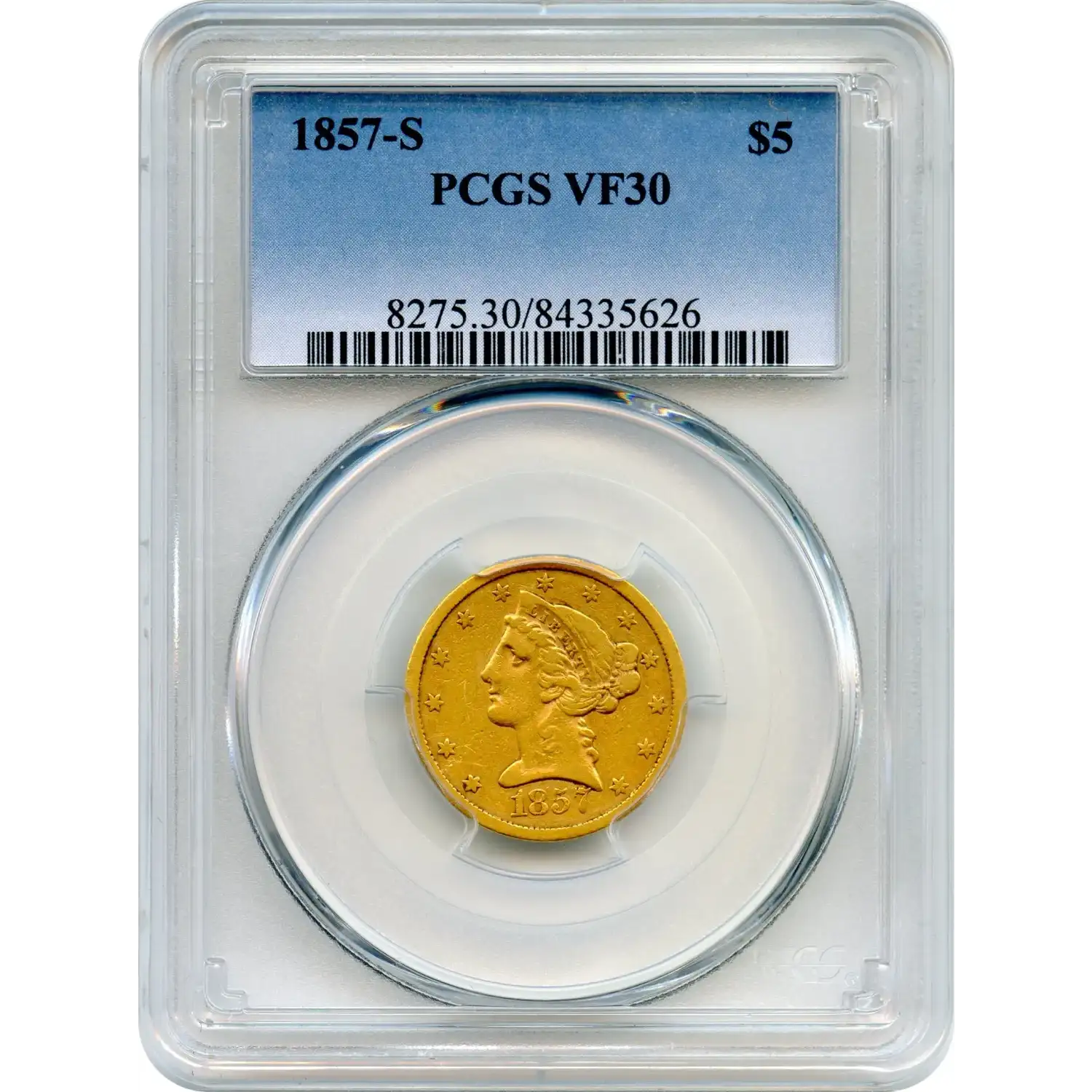 Struck during the height of the California Gold Rush era, the 1857-S Liberty Head half eagle reflects the rapid growth of gold coinage on the West Coast. Produced at the San Francisco Mint, this issue came from a young branch facility working to convert newly mined gold into circulating coinage for a booming regional economy. Many examples entered everyday commerce immediately after striking.