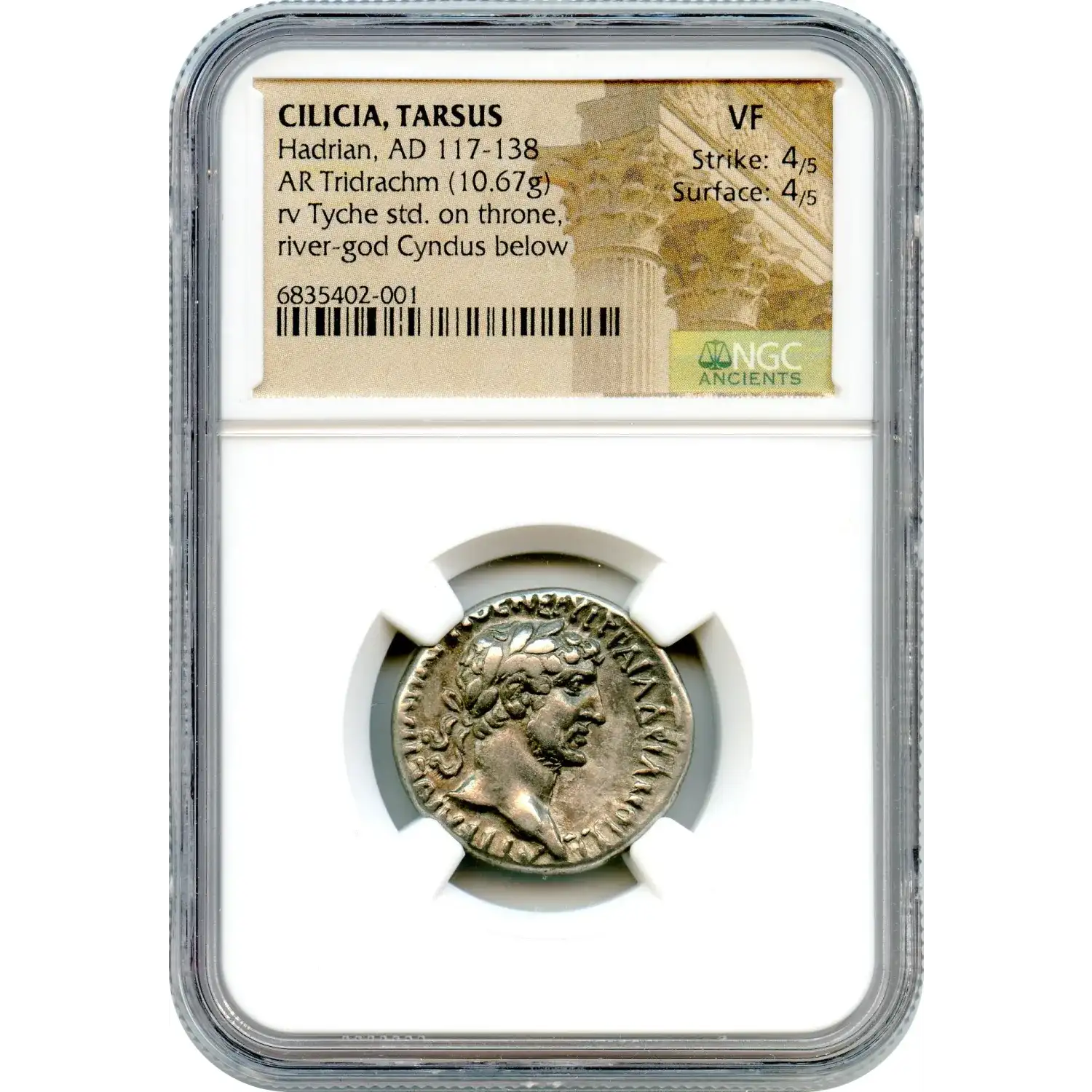 This silver tridrachm from Tarsus in Cilicia was minted under Emperor Hadrian (117–138 CE). Tarsus, the provincial capital and major trade center on the Cydnus River, produced Roman provincial coinage blending imperial portraiture with local Hellenistic traditions.