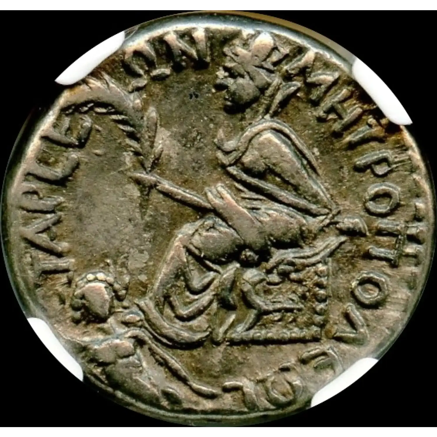 Reverse: Turreted and veiled Tyche (city goddess/Fortune) seated left on a throne, extending a palm branch in her right hand (symbol of victory/prosperity); cornucopia or scepter often in left. At her feet, the river-god Cydnus swims left, crowned with sedge reeds, personifying the fertile, navigable river vital to Tarsus’s economy. All within a dotted border; ethnic ΤΑΡΣΕΩΝ ΜΗΤΡΟΠΟΛΕΩΣ (“of the Metropolis of the Tarsians”) arcs around.