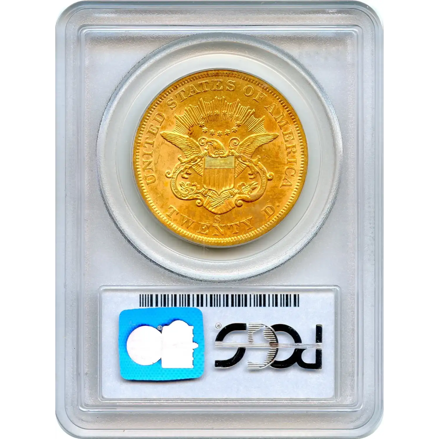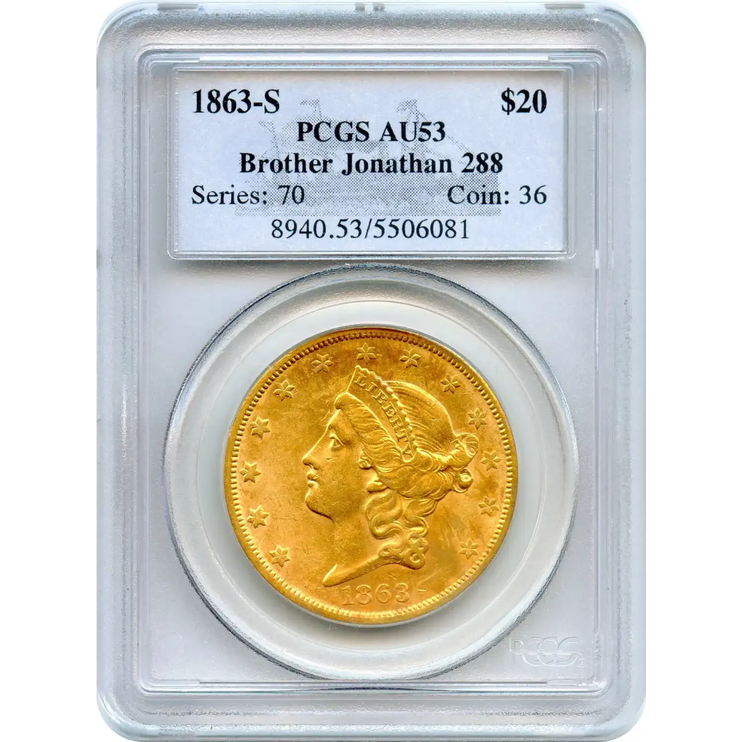Recovered from the wreck of the S.S. Brother Jonathan, this piece is part of a group of 116 examples of the 1863-S $20 discovered in the treasure, spanning grades from Extremely Fine-40 to Mint State-63. The find dramatically expanded the known population and provided fresh insight into the preservation of San Francisco double eagles shipped along the Pacific Coast.