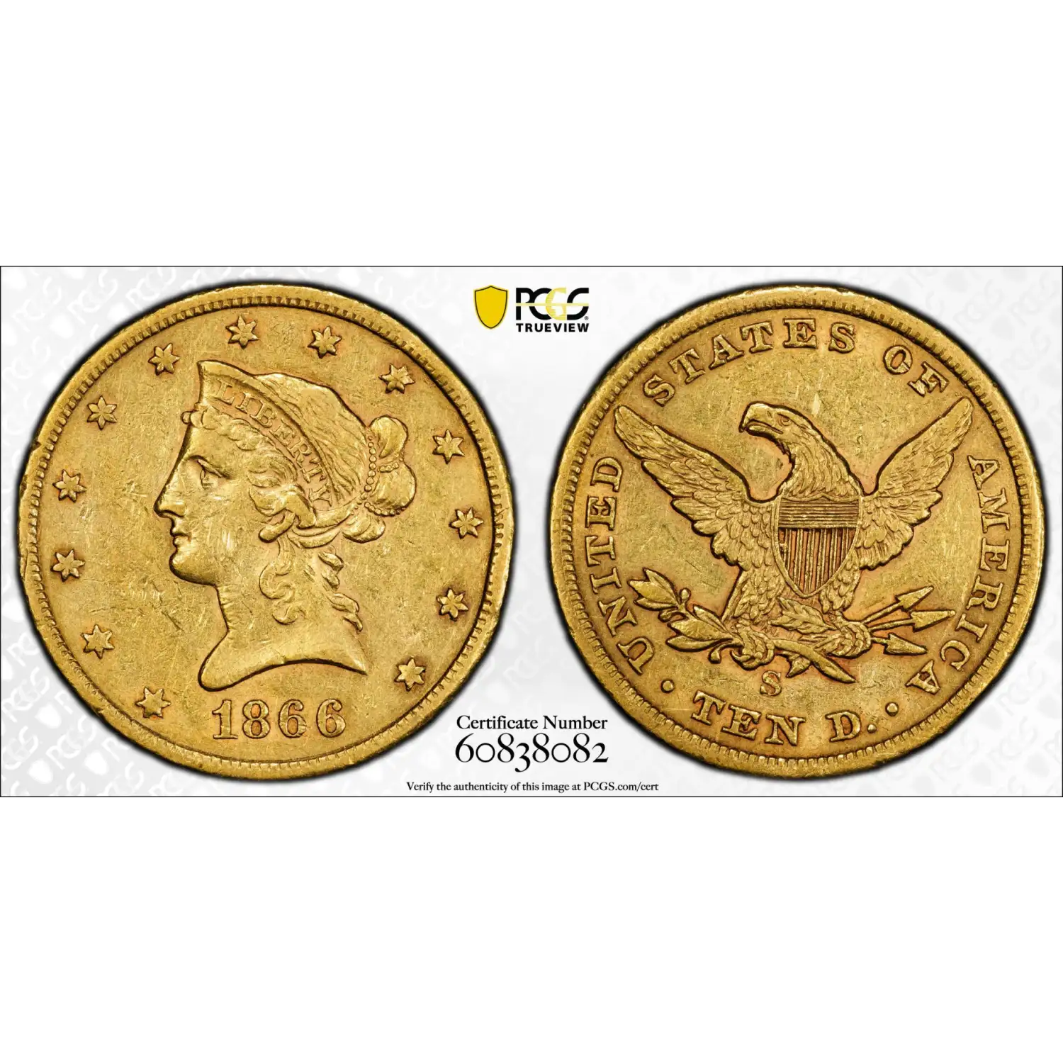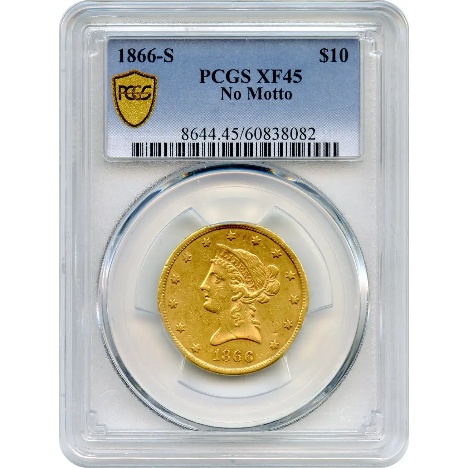 In 1866, the motto IN GOD WE TRUST made its debut on the American eagle — but not before the San Francisco Mint struck one final, quiet farewell to the old design. Just 8,500 No Motto eagles were produced before the new type took over, and the passage of time has been unforgiving: PCGS CoinFacts estimates only 40 to 55 examples survive across all grades, making this one of the more elusive issues of the era.
