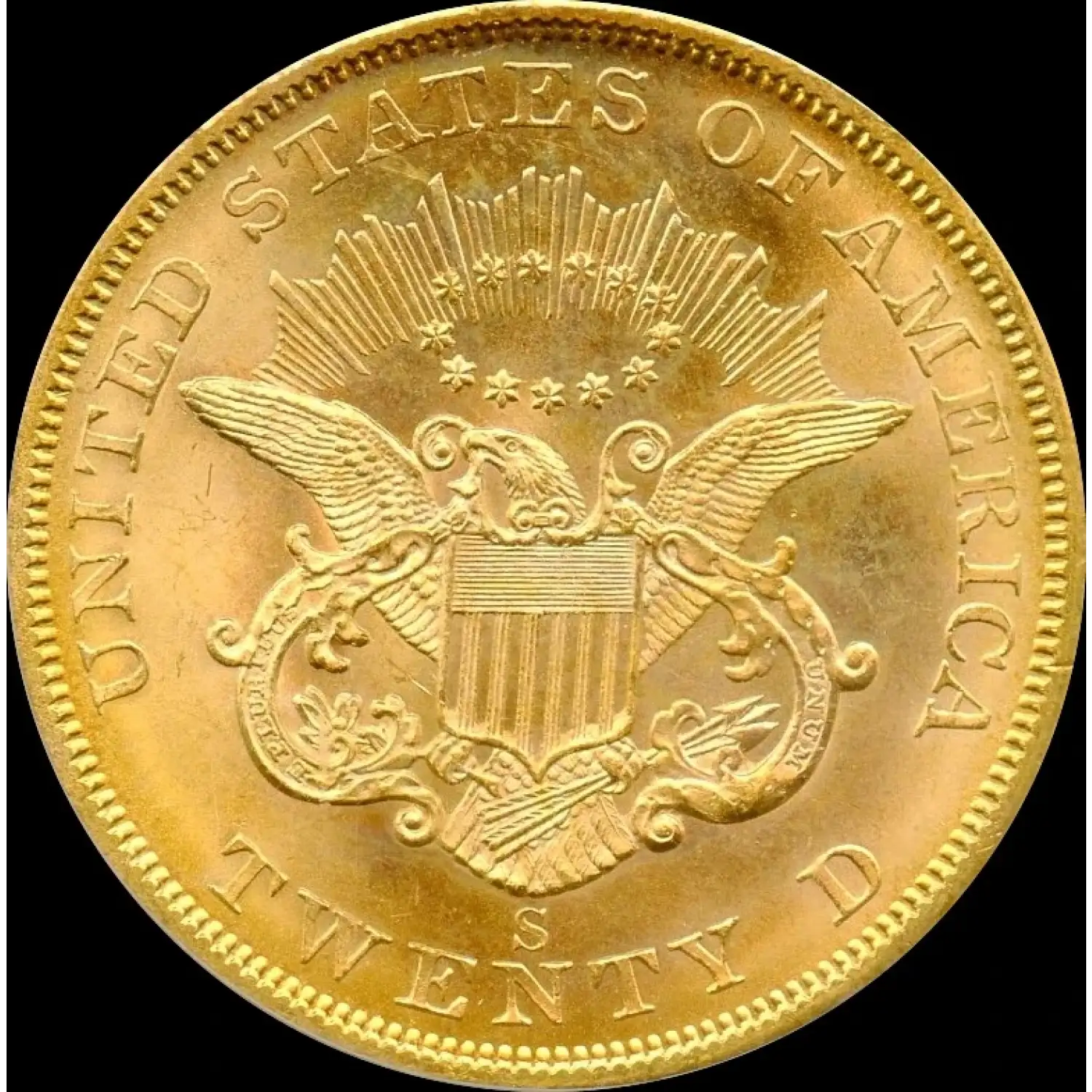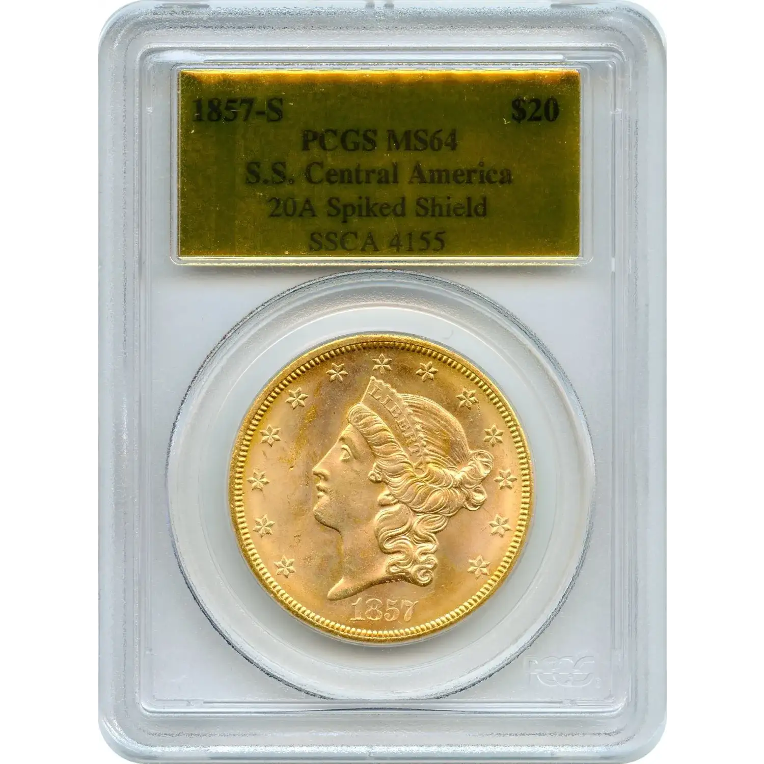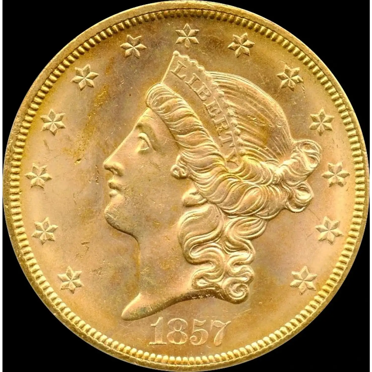 The 1857-S $20 Liberty Head Double Eagle, 20A Spiked Shield variety, is a stunning beauty that survived the tragic wreck of the SS Central America. Struck during the height of the California Gold Rush, this San Francisco issue embodies both the ambition and peril of mid-19th century American commerce, its journey cut short when the ship sank in a hurricane off the coast of the Carolinas.